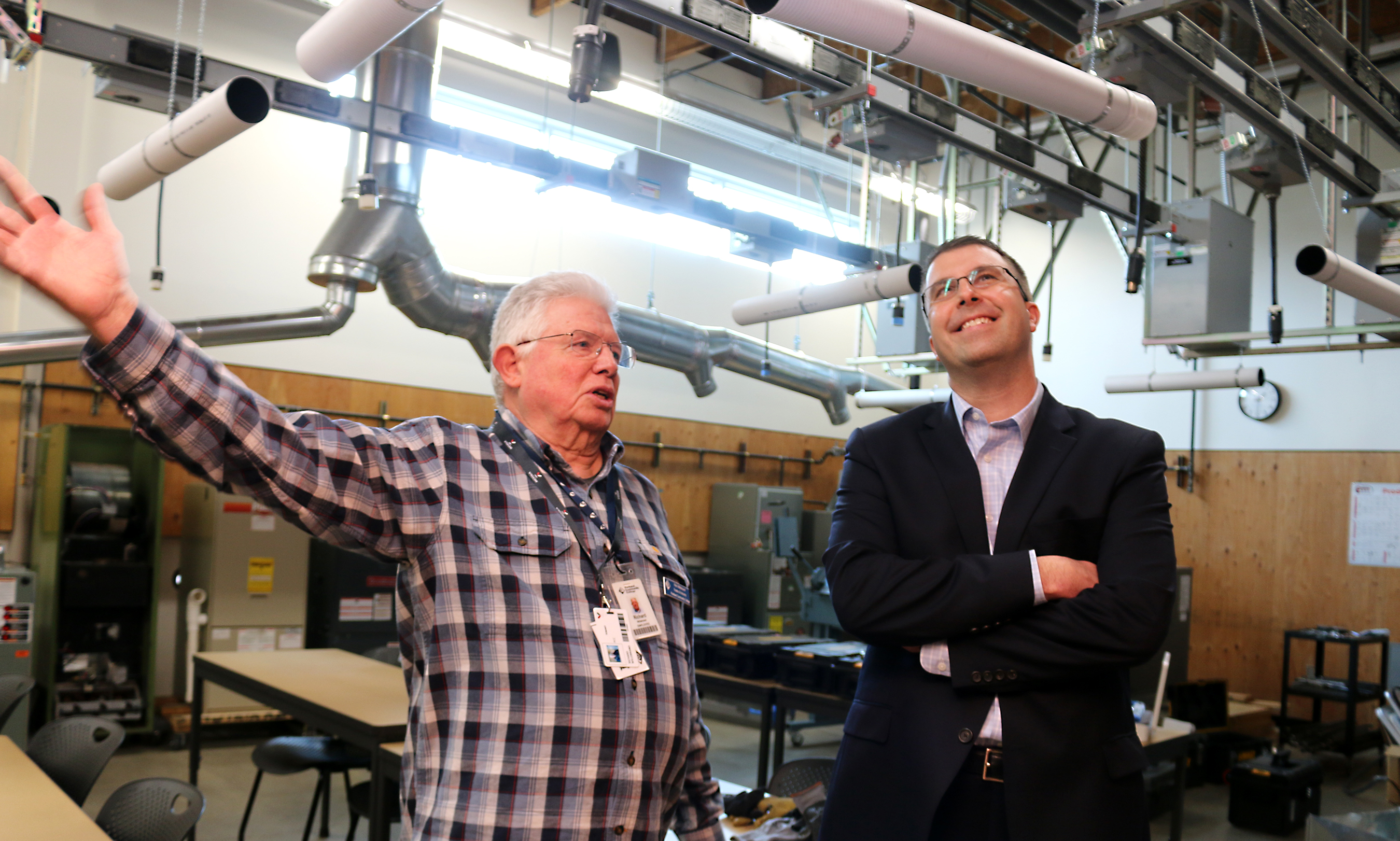 Hurley was joined by Kinder, Karin Edwards (Cascade Campus president), Marc Goldberg (Associate Vice President of Workforce Development and Continuing Education) and Matt Chase (Corporate & Foundation Relations Officer for the PCC Foundation). Richard Willbrand, instructor in the Trades and Industry program, walked the group to each specialized trades area of the center, including showcasing the HVAC shop with rows of the latest furnaces and air conditioners.