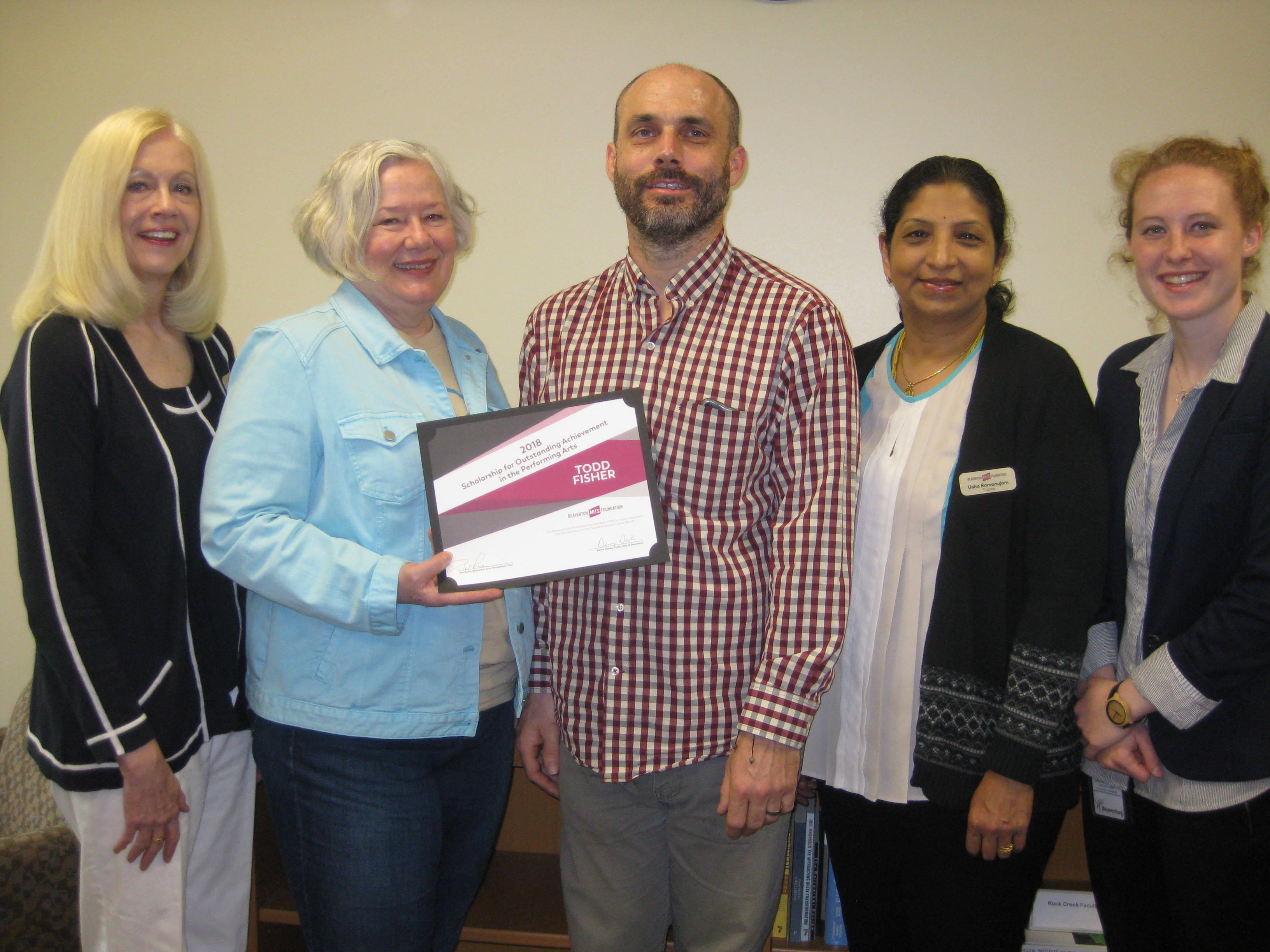 On hand to celebrate the scholarship recognition were (left, Diana Sullivan, Beaverton Arts Foundation (BAF) Trustee and PCC faculty; Campus President Sandra Fowler-Hill; student Todd Fisher; Usha Ramanujam, BAF Trustee and PCC faculty; and Rachael Hershey, BAF Administrator.
