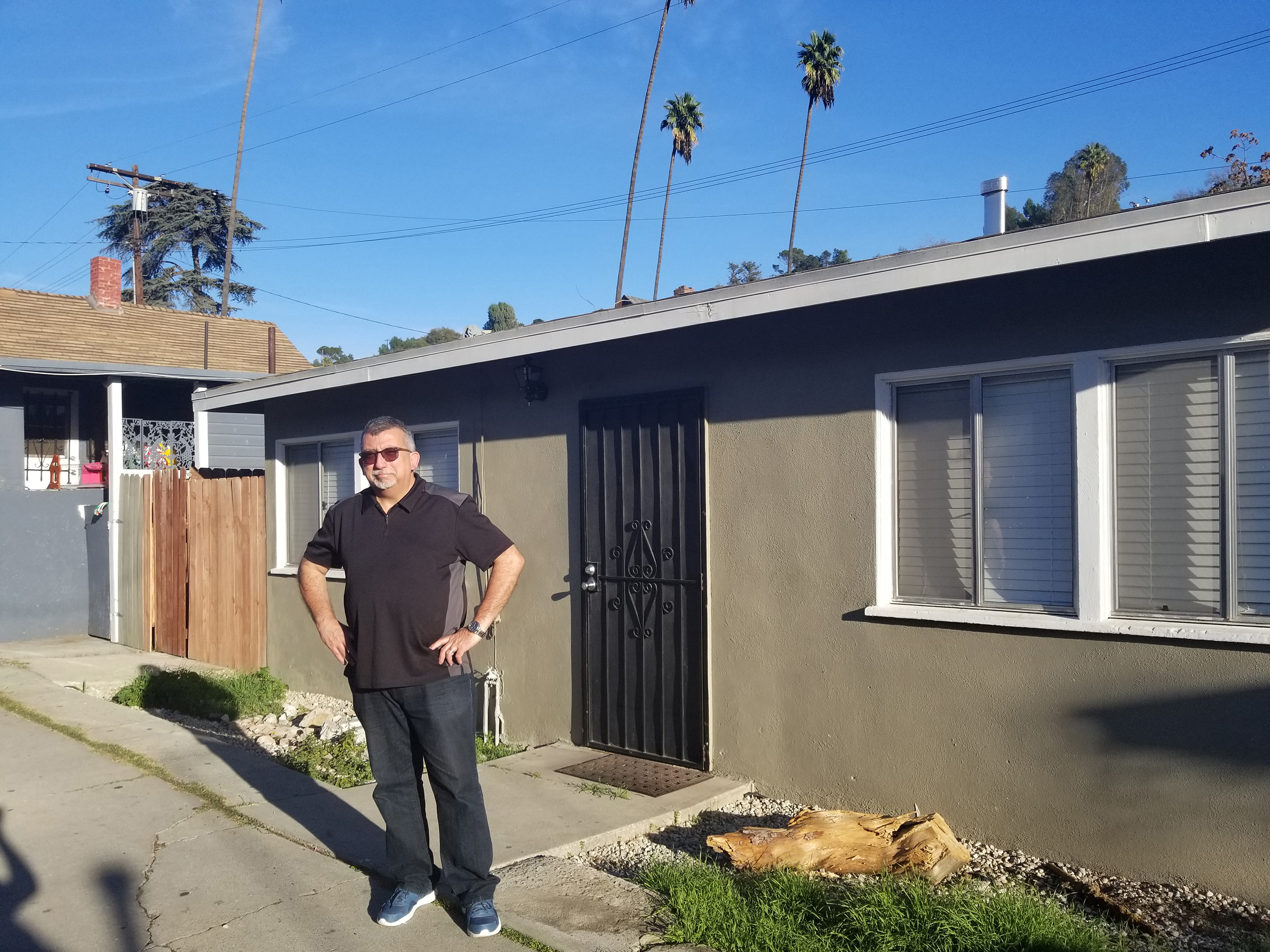 Villa standing outside his childhood home in East L.A. where he’d take a bus across town to attend Catholic school.
