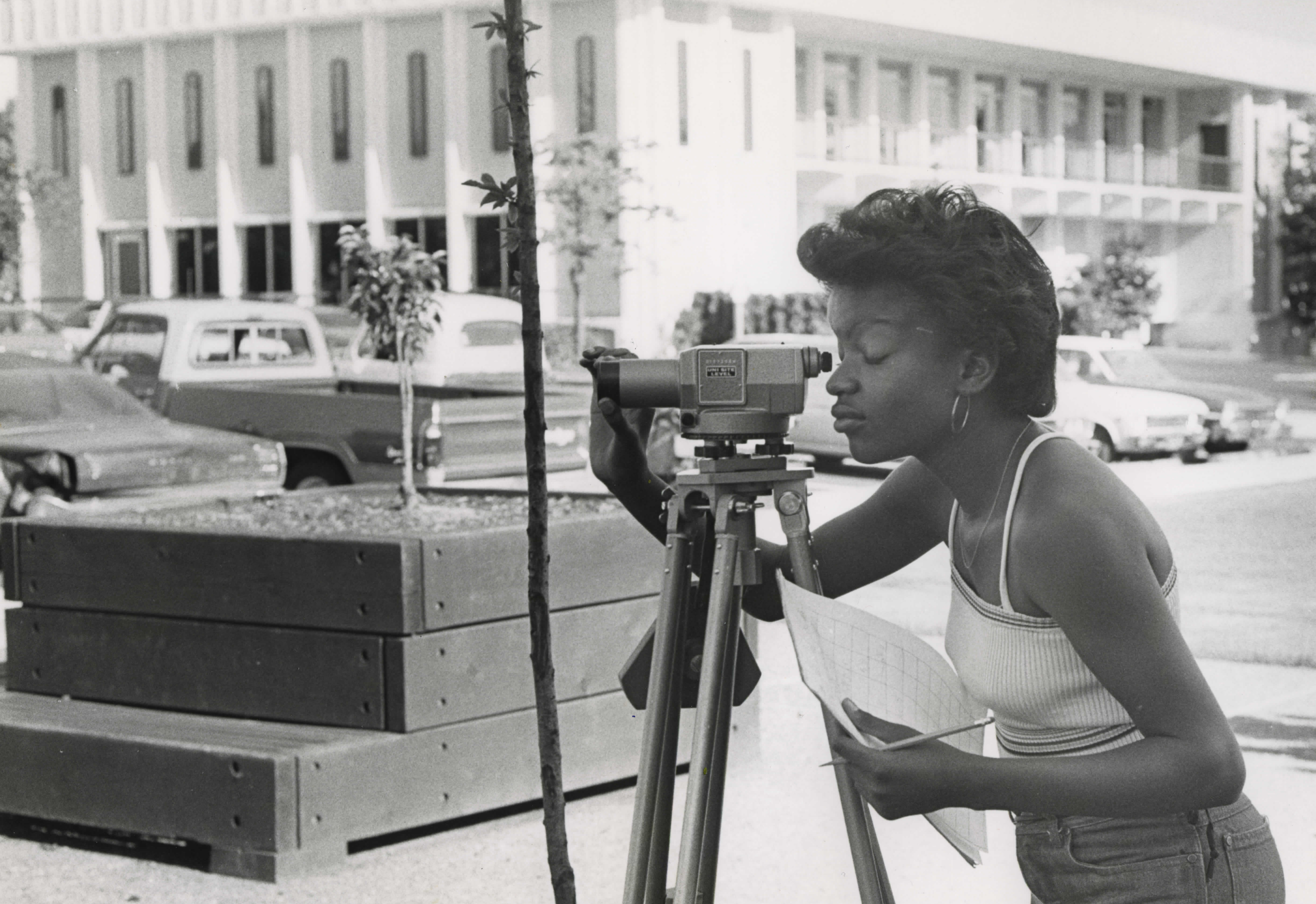 I believe the woman looking through the surveyor’s scope is standing near the old Student Center at the Cascade Campus. This was before the existing library building was added to it. Now the Student Center is gone (except on all the campus maps) but the library remains.