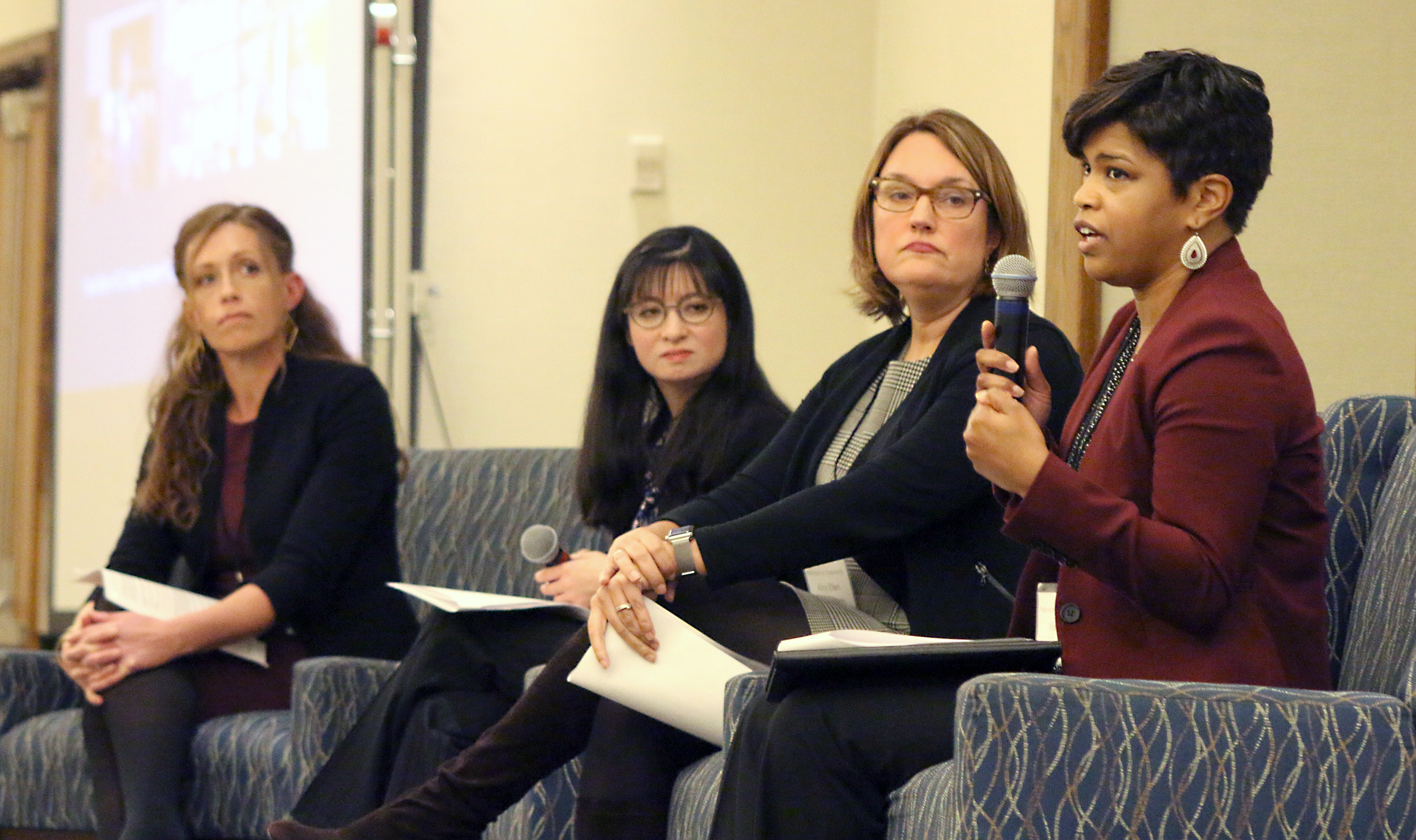 Melissa Johnson of the National Skills Coalition discusses the challenges of closing the opportunity gaps for community college students. From left to right, Kate Kinder (Career Pathways Director), Bri Nguyen (Seattle Jobs Initiative) and Amy Ellen Duke-Benfield (Center for Law and Social Policy) listen.