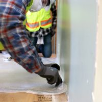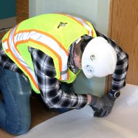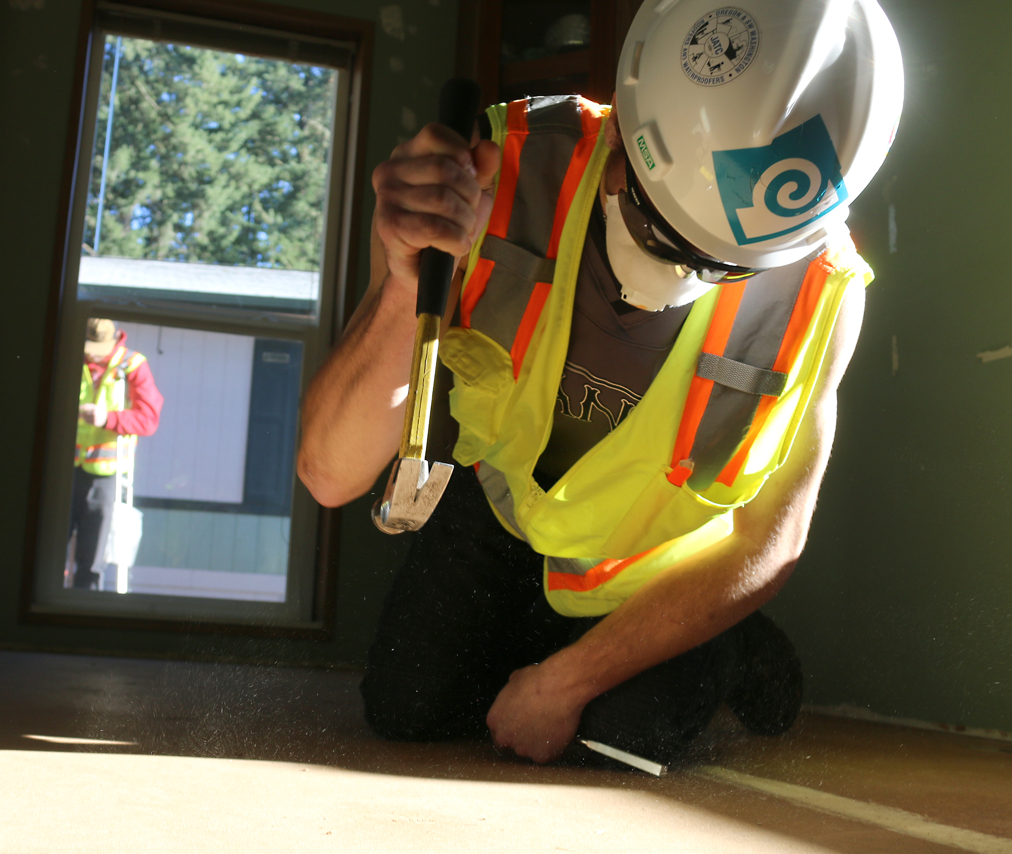 Through a partnership with Rebuilding Together Washington County, instructor Enrique Maldonado and trades coordinator Sal Castañeda Jr. led the class in fixing mold issues, flooring, plumbing and HVAC. The day of volunteer work provided the students, who are seeking careers in the trades, the chance to build the necessary skills needed to meet the minimum entry qualifications to enter a trade or apprenticeship program.Student working on flooring.