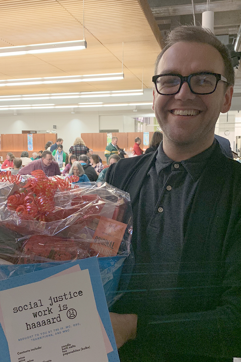 Health Admissions Specialist Rick Maas with the basket he won from the student development resource centers.