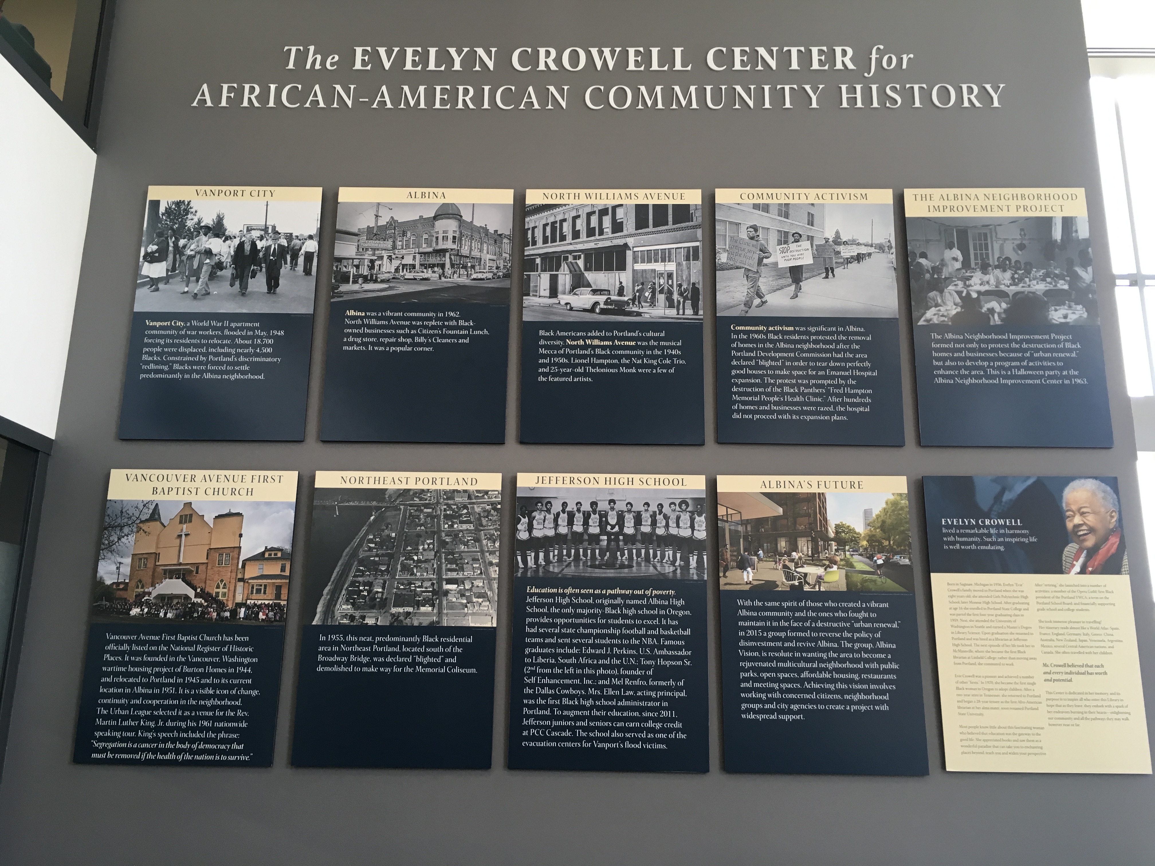 The center is comprised of a series of panels depicting the many decades of African American life in inner North and Northeast Portland, tracing the history of the Albina district from the Vanport flood of 1948 through the Civil Rights Era to the present day and beyond. It was curated by James Harrison, a local historian and former instructor at the campus.