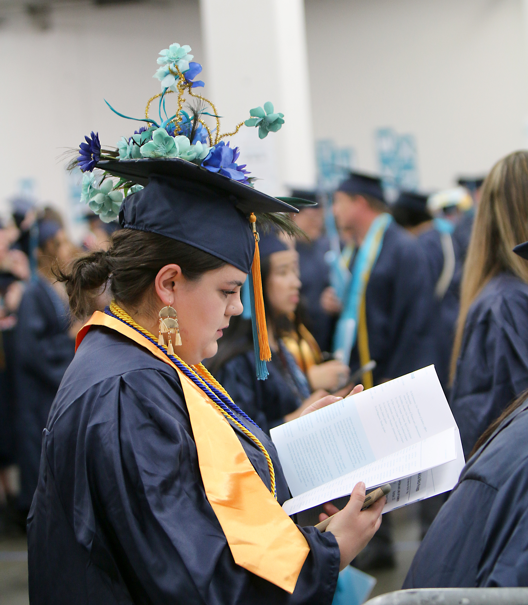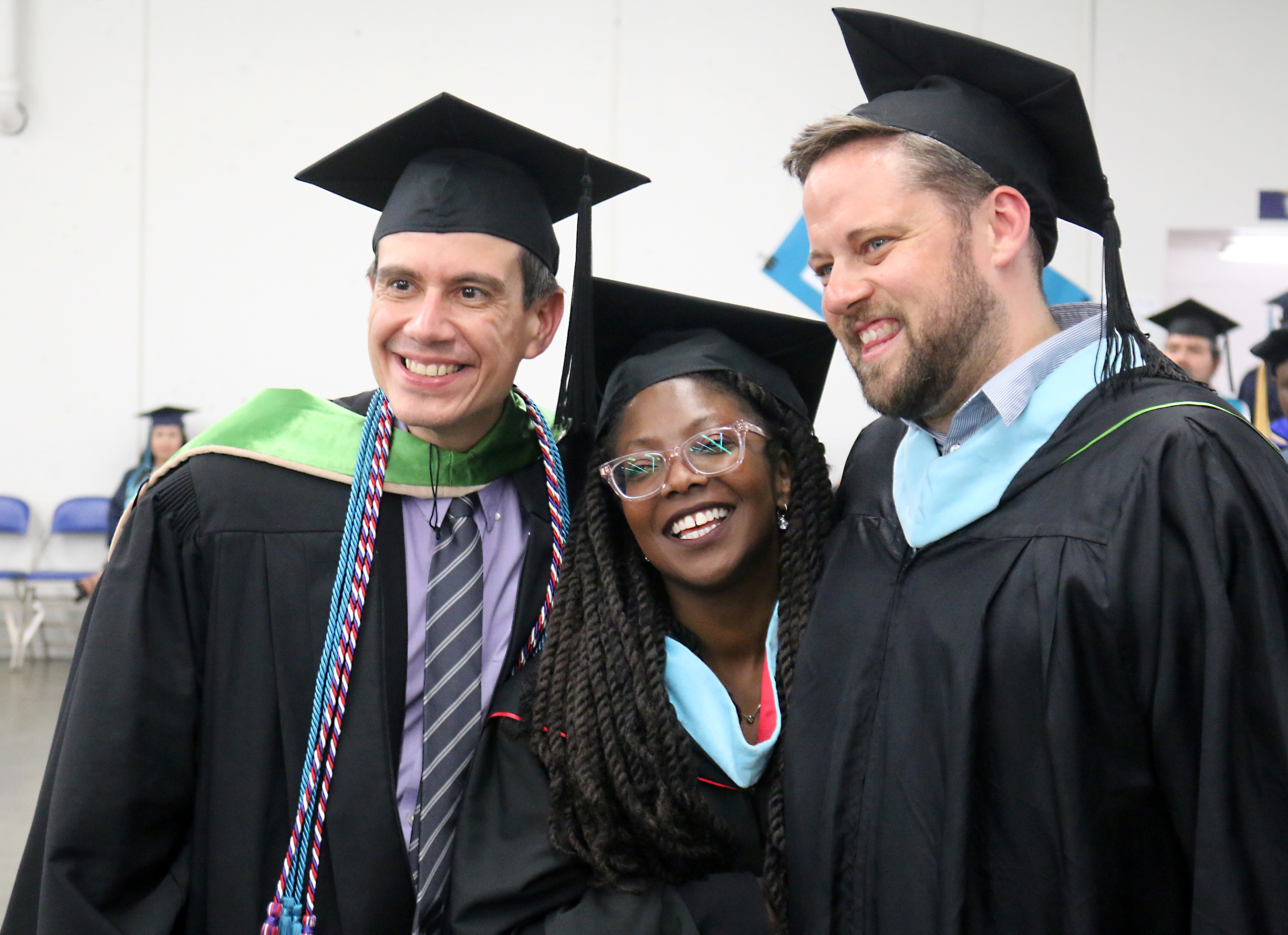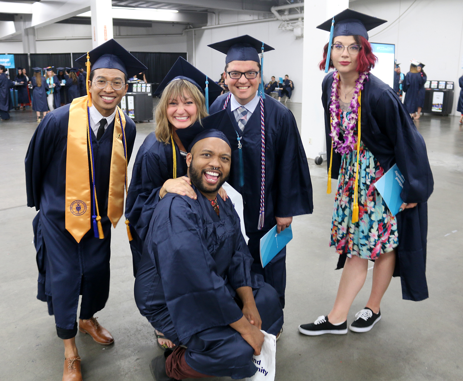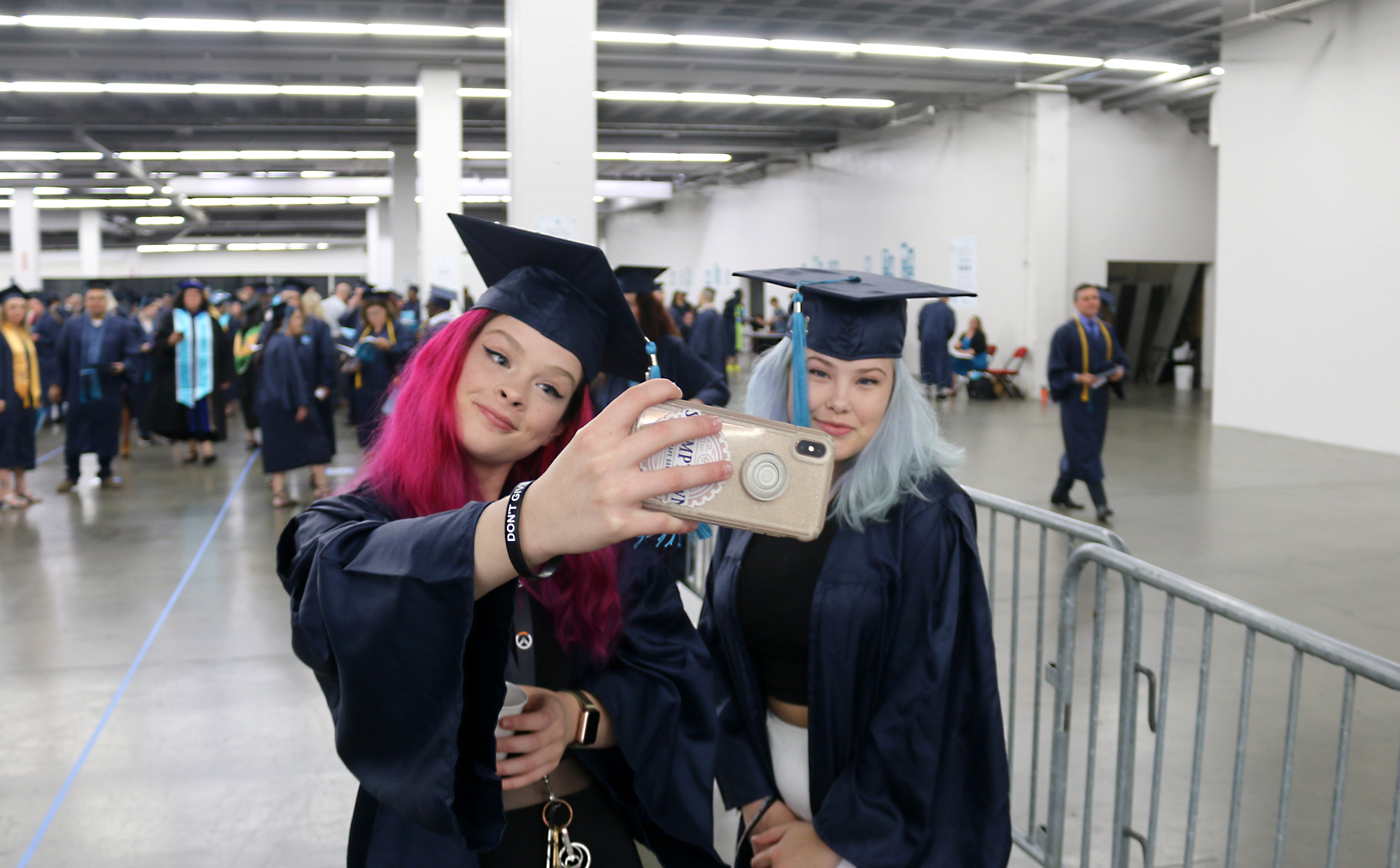 In the staging area near the arena, graduates were treated to a “fun zone” where they could get their selfies taken with colorful swag, masks and buttons to document their accomplishments.