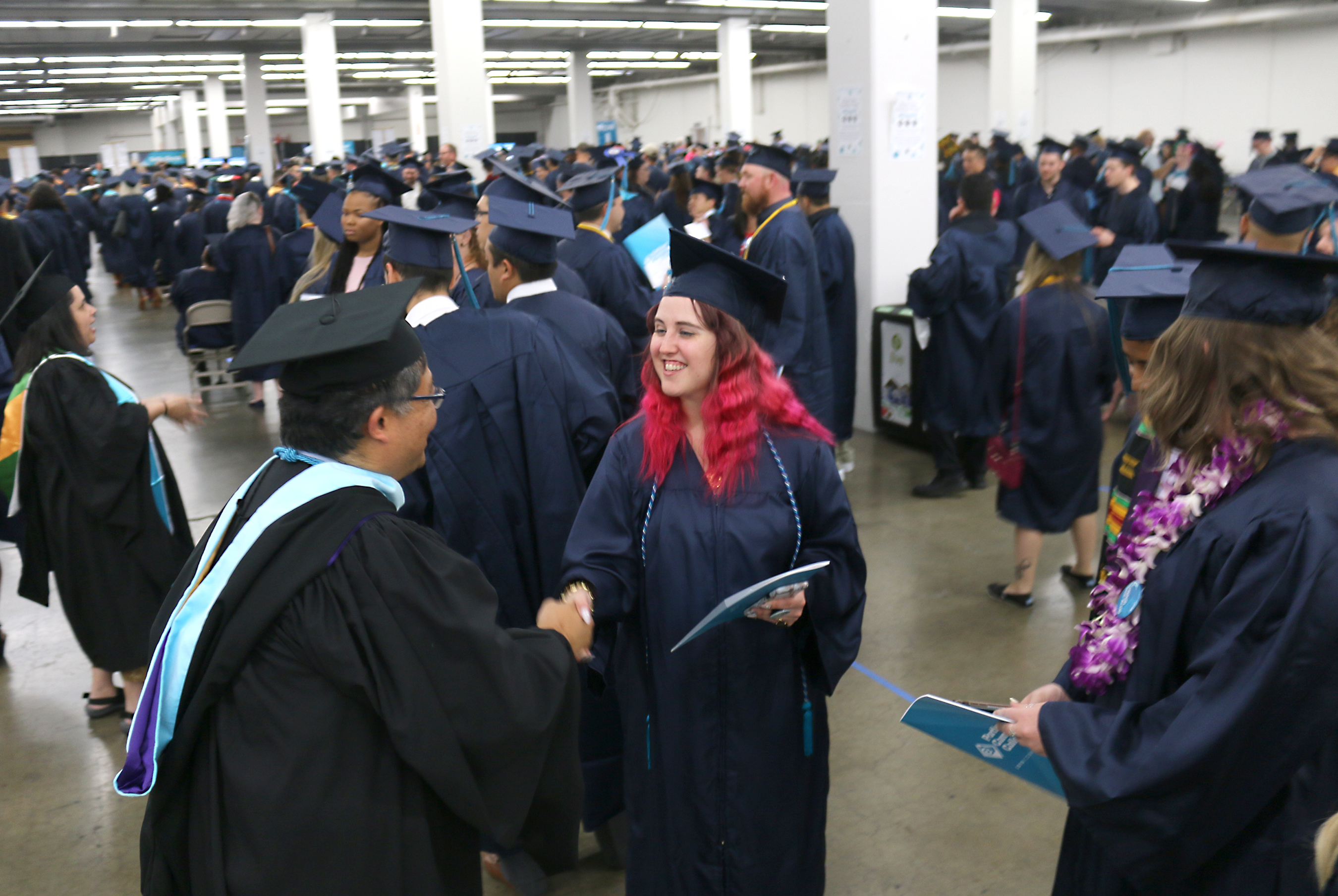 PCC President Mark Mitsui walks through the staging area to congratulate the 2019 graduates.