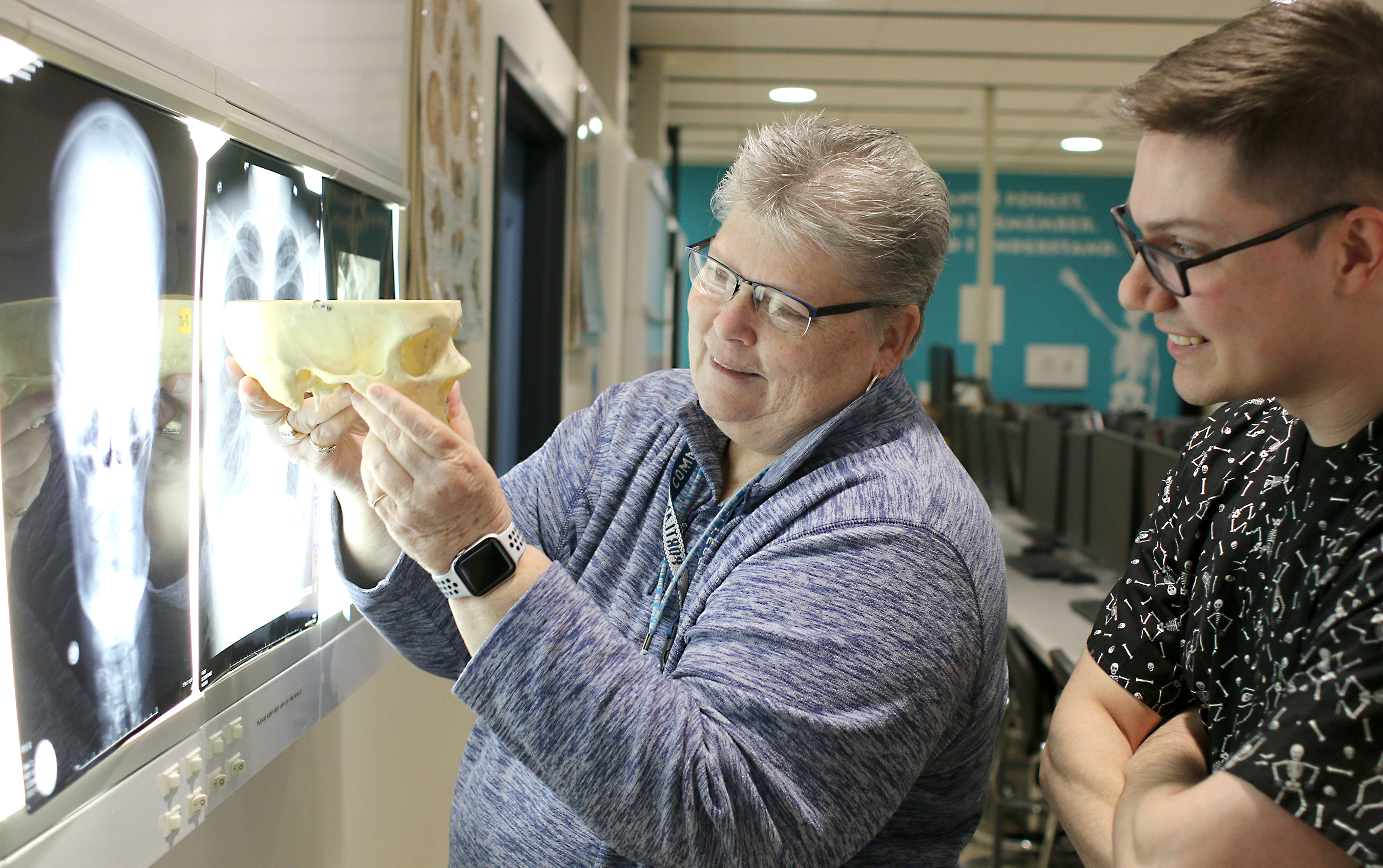 Instructor Gayle Wright and student Jonah Scott analyze x-rays in the radiography lab.