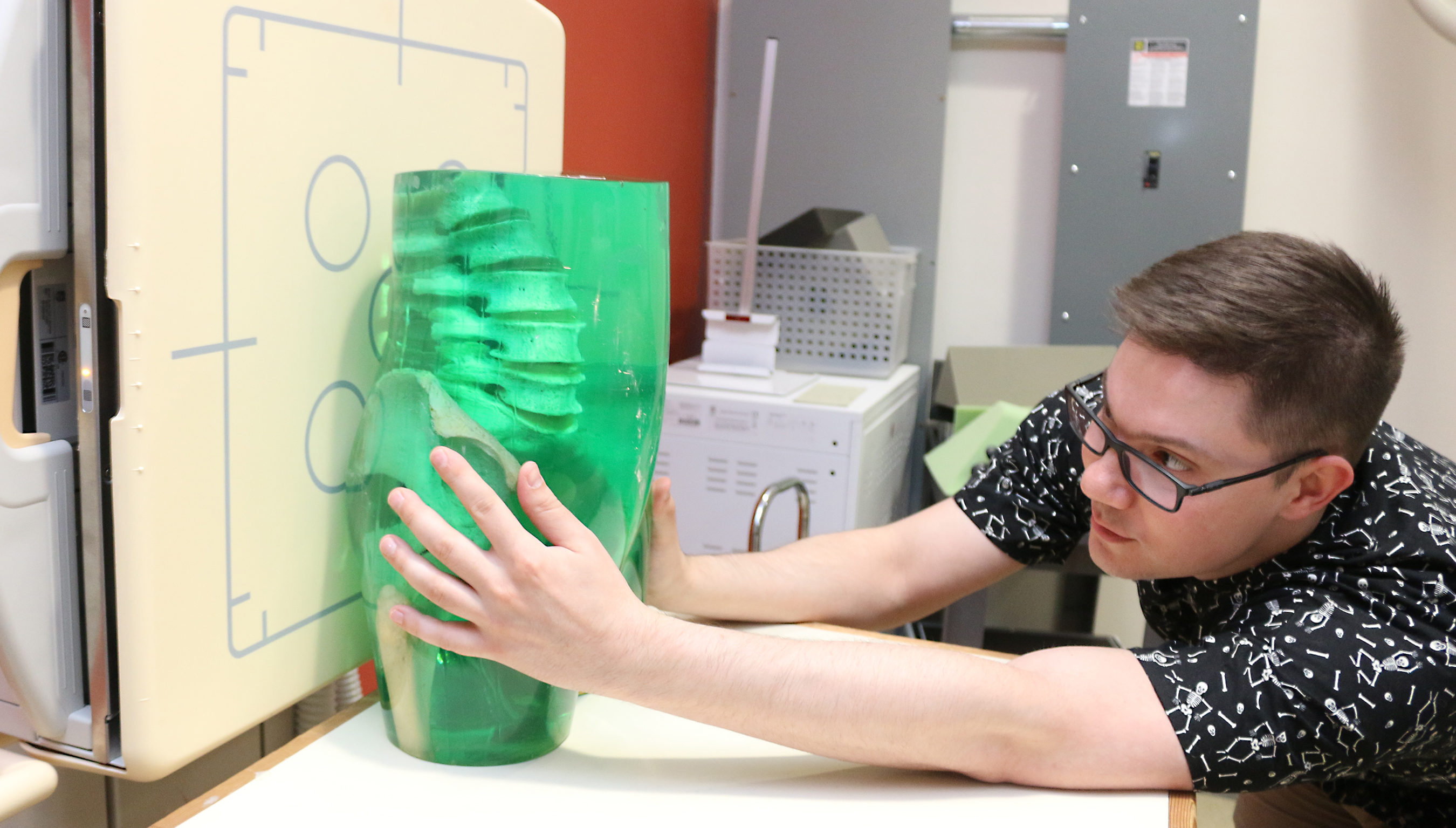 Jonah Scott positions rubber torso for an x-ray.