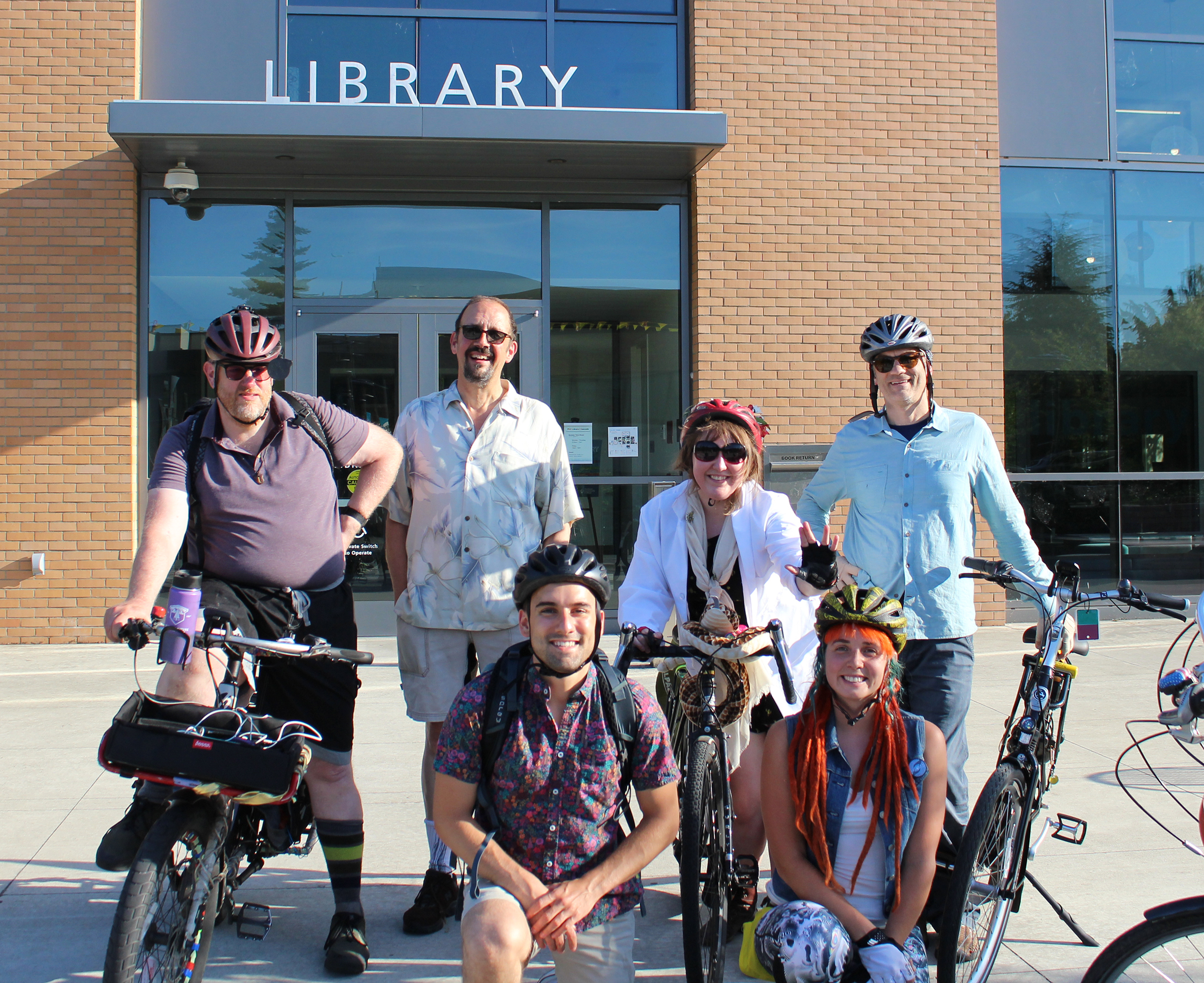 Gratreak with her biking crew in front of the Cascade Library, where she worked many years to help pay for college.