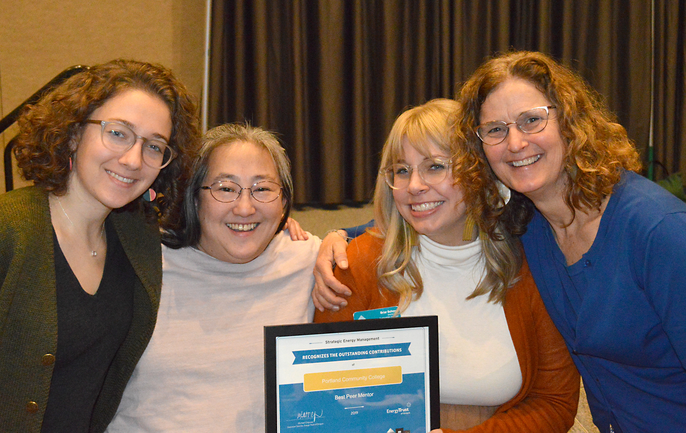 Accepting the Energy Trust of Oregon’s Best Peer Mentor award are Anna Brown (strategic energy associate), Stephania Fregosi (sustainability analyst), Briar Schoon (sustainability manager) and Elaine Cole (sustainability coordinator).