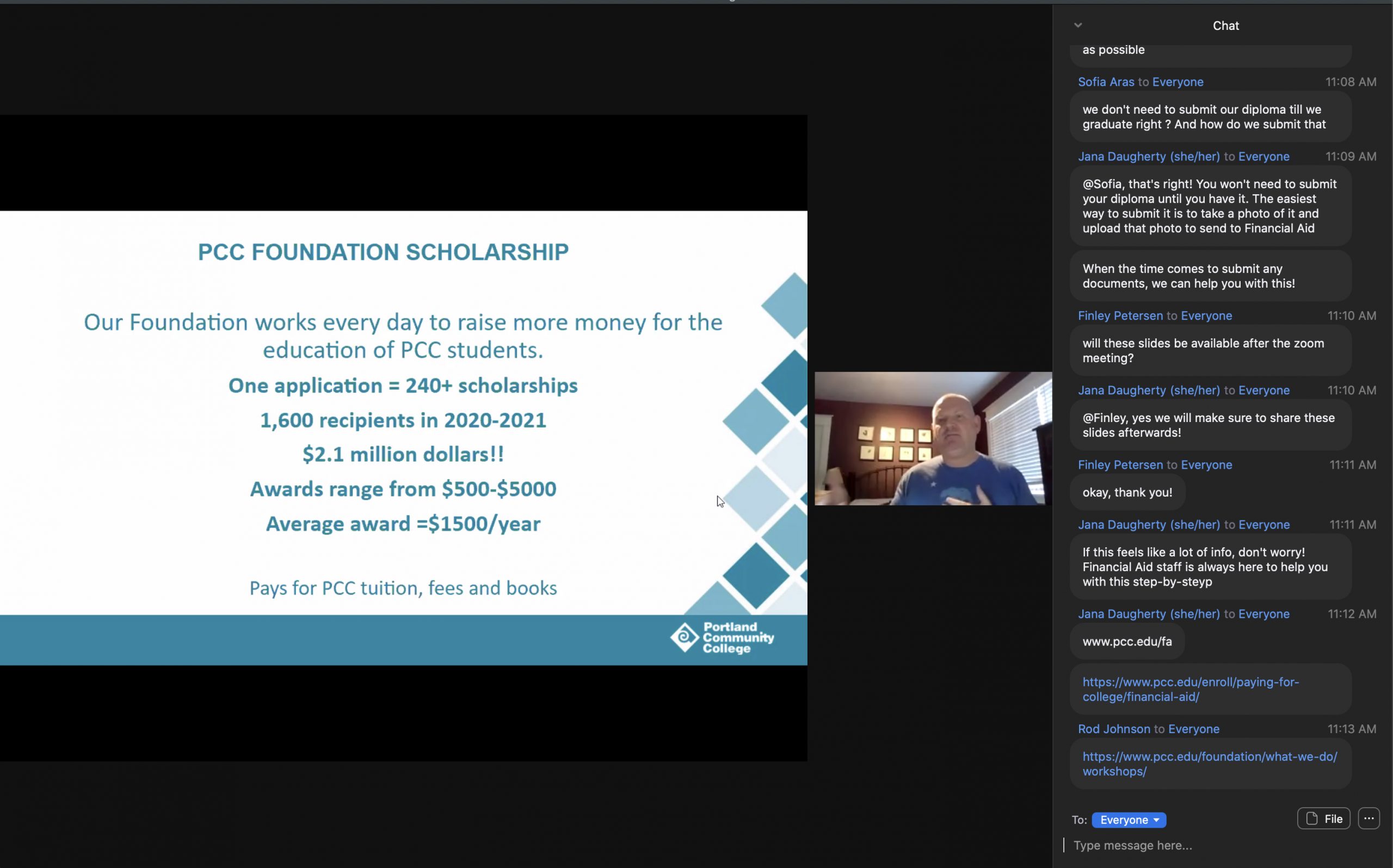 Breakout sessions like “Paying for College” and “University Transfer,” as well as degree- and certificate-focused rooms are available for the high school students to join via Zoom to listen to staff and pose questions. For example, roughly 40 attended “Paying for College” where recruitment, financial aid and PCC Foundation staff presented and answered questions.