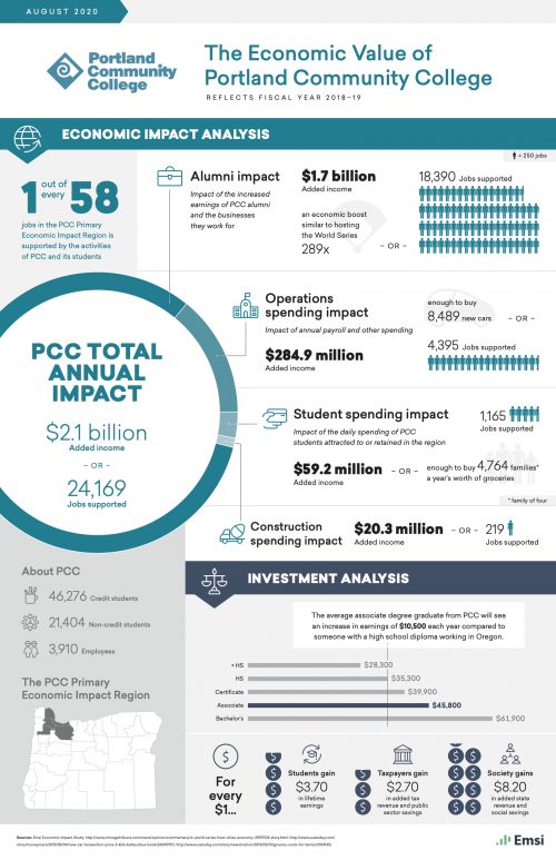 An economic impact study found that Portland Community College creates billions of dollars in value for the state’s economy and plays a key role in helping students increase their employability and achieve their goals.
