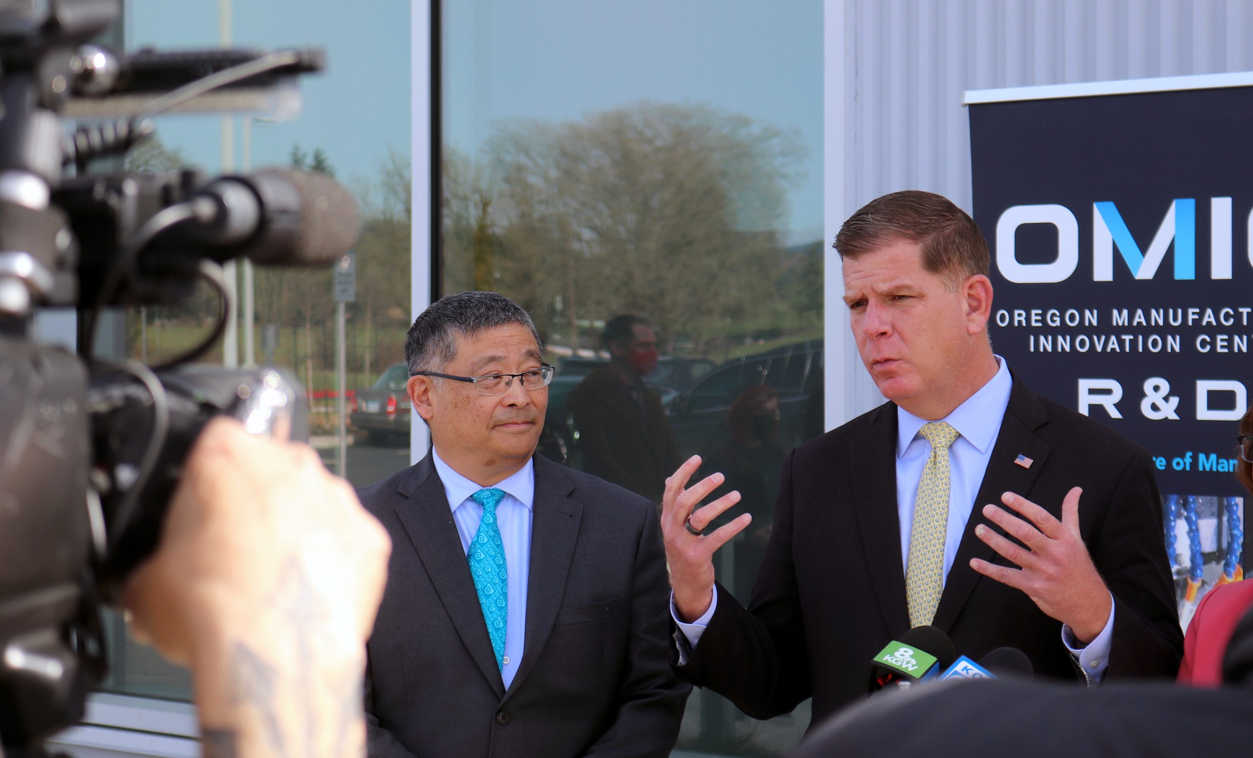 U.S. Secretary of Labor Marty Walsh with PCC President Mark Mitsui talks to the media about what they learned on the PCC tour.