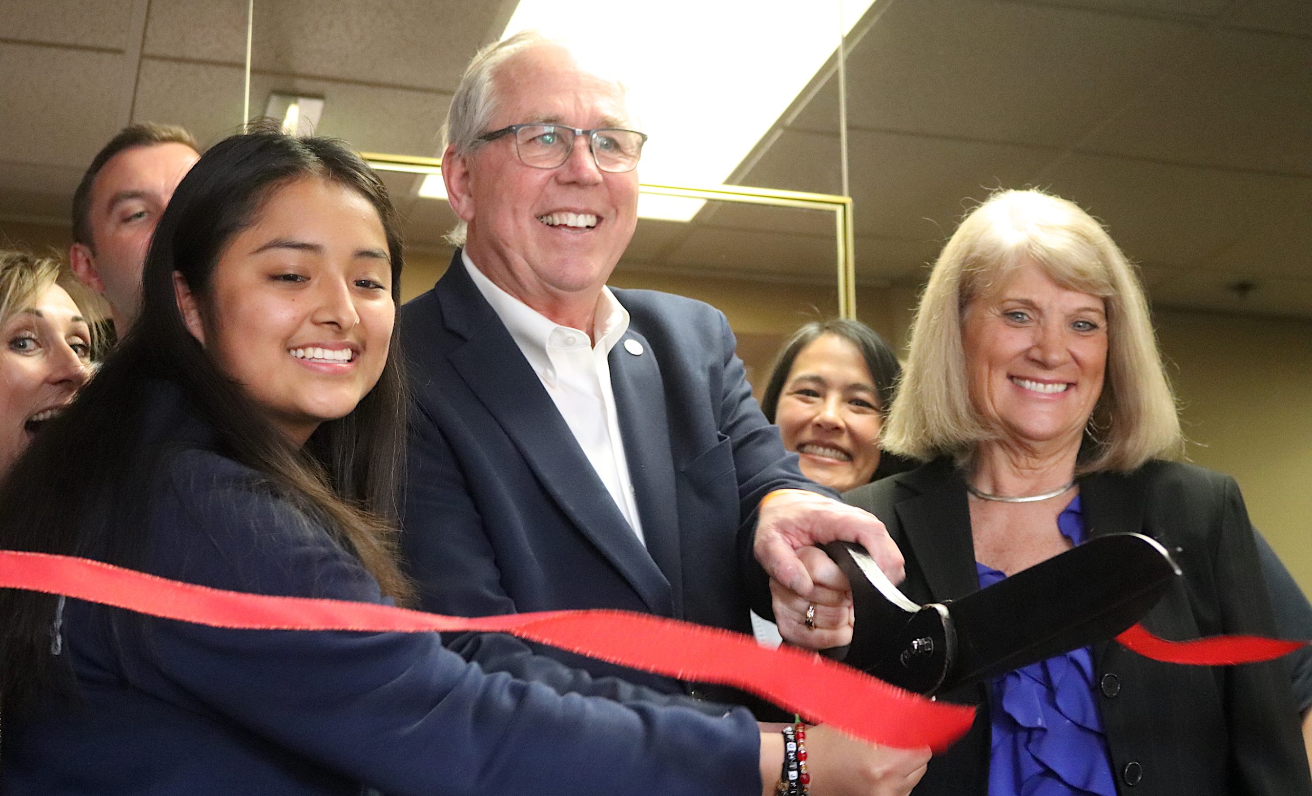 Student Ivette Alonso Garcia (left) with Hillsboro Mayor Steve Callaway and former Oregon International Airshow CEO Judy Willey help cut the ribbon to the new classroom. PCC's Katy Ho in the background.