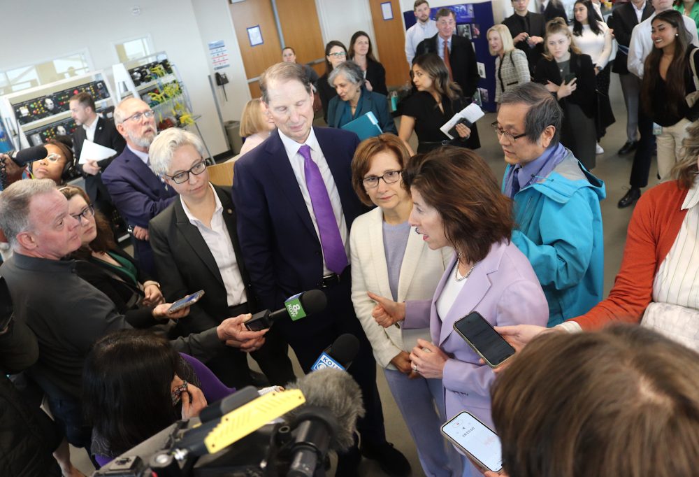 High fiveU.S. Secretary of Commerce Gina Raimondo (center in purple) with, from left, PCC President Adrien Bennings, Oregon Governor Tina Kotek, Congresswoman Suzanne Bonamici, U.S. Senator Ron Wyden, State Rep. Janelle Bynum and State Sen. Janeen Sollman.media scrum