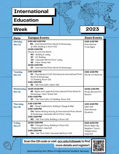 Throughout the week, PCC will offer a range of engaging activities, ensuring that students, faculty, and the community have the opportunity to participate in this global celebration. Highlights include a flag garland craft workshop, an international photo booth with giveaways, a delightful assortment of snacks from around the world, and an informative study abroad information session.