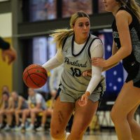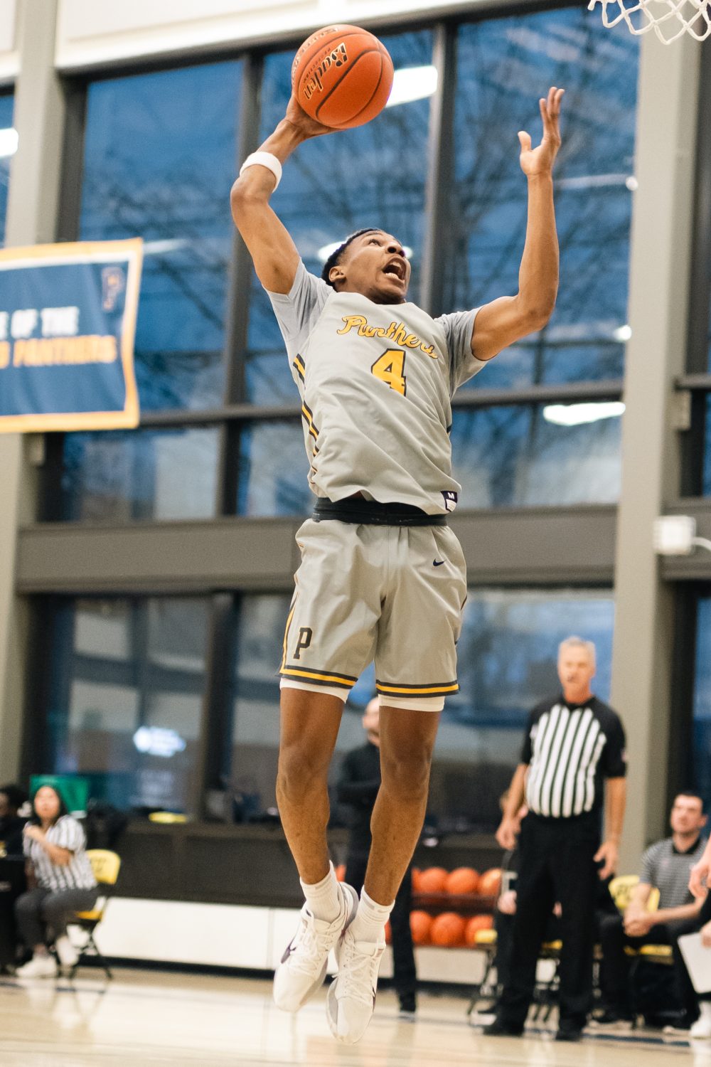 Top scorer Jahvari Martino leaps as PCC faces SW Oregon on January 6, 2024.