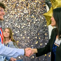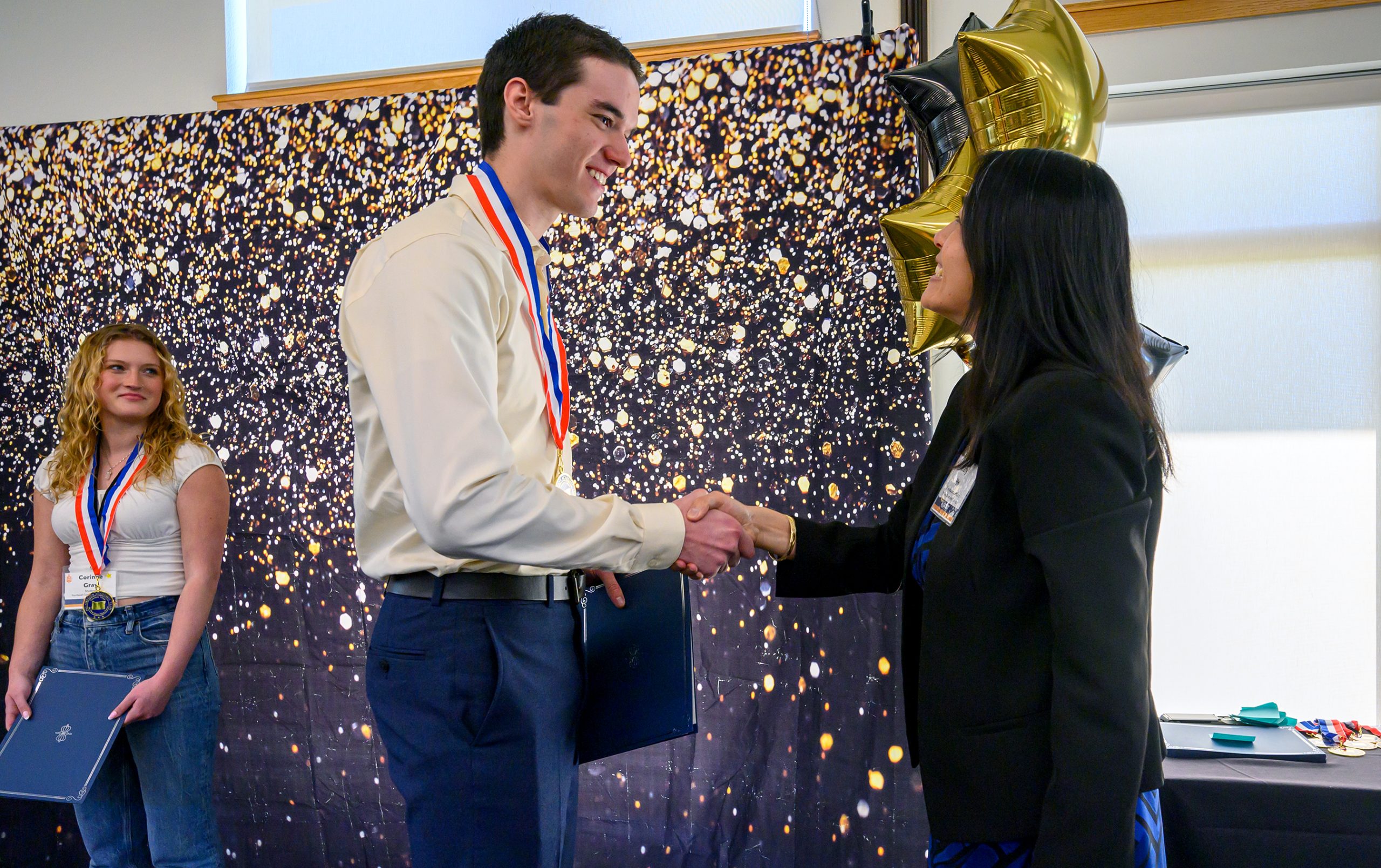 PCC scholar Jesse Hauck receives congratulations from Vice President of Academic Affairs Katy Ho.