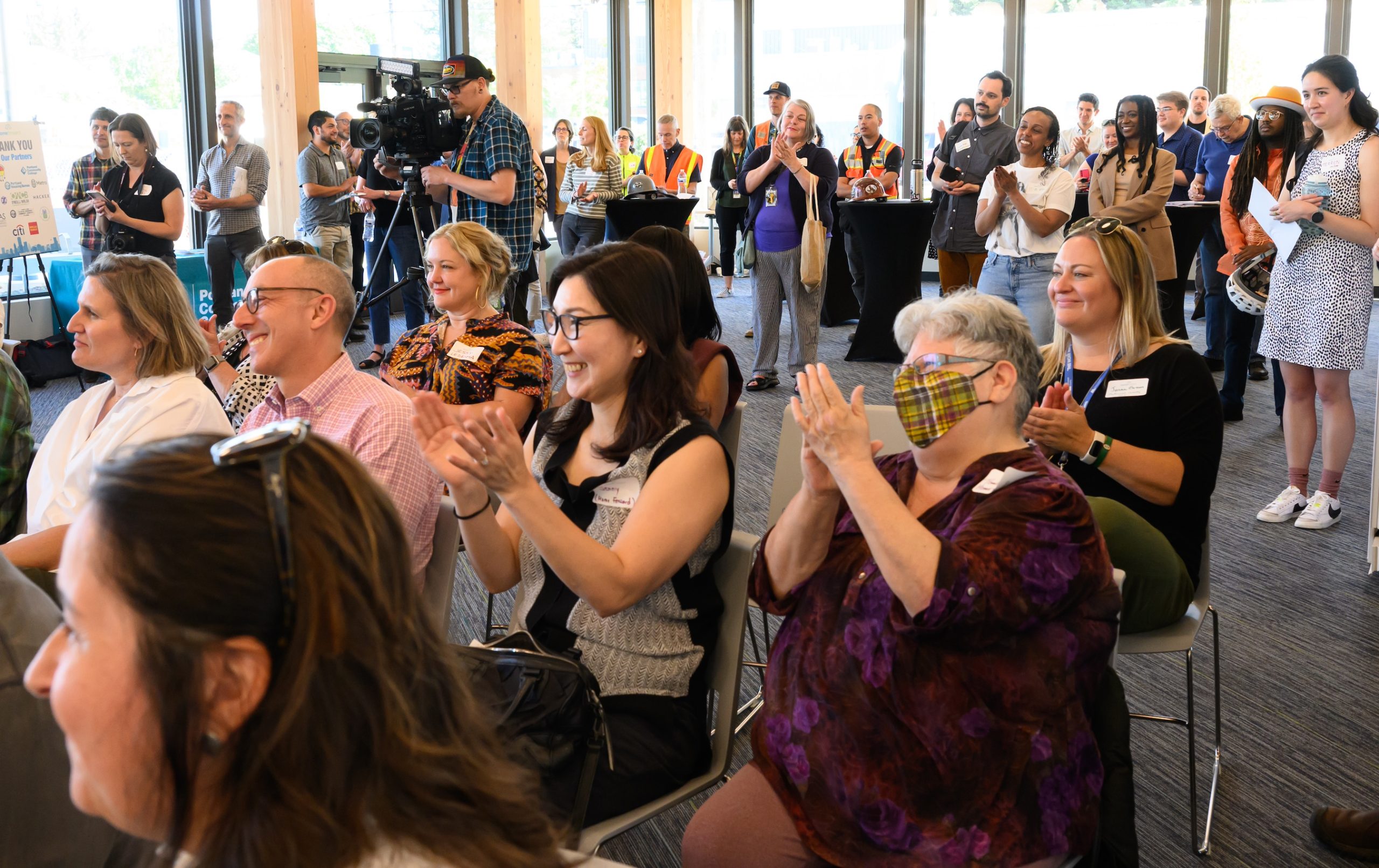 Attendees cheer the groundbreaking for the new affordable housing complex -- Killingsworth.