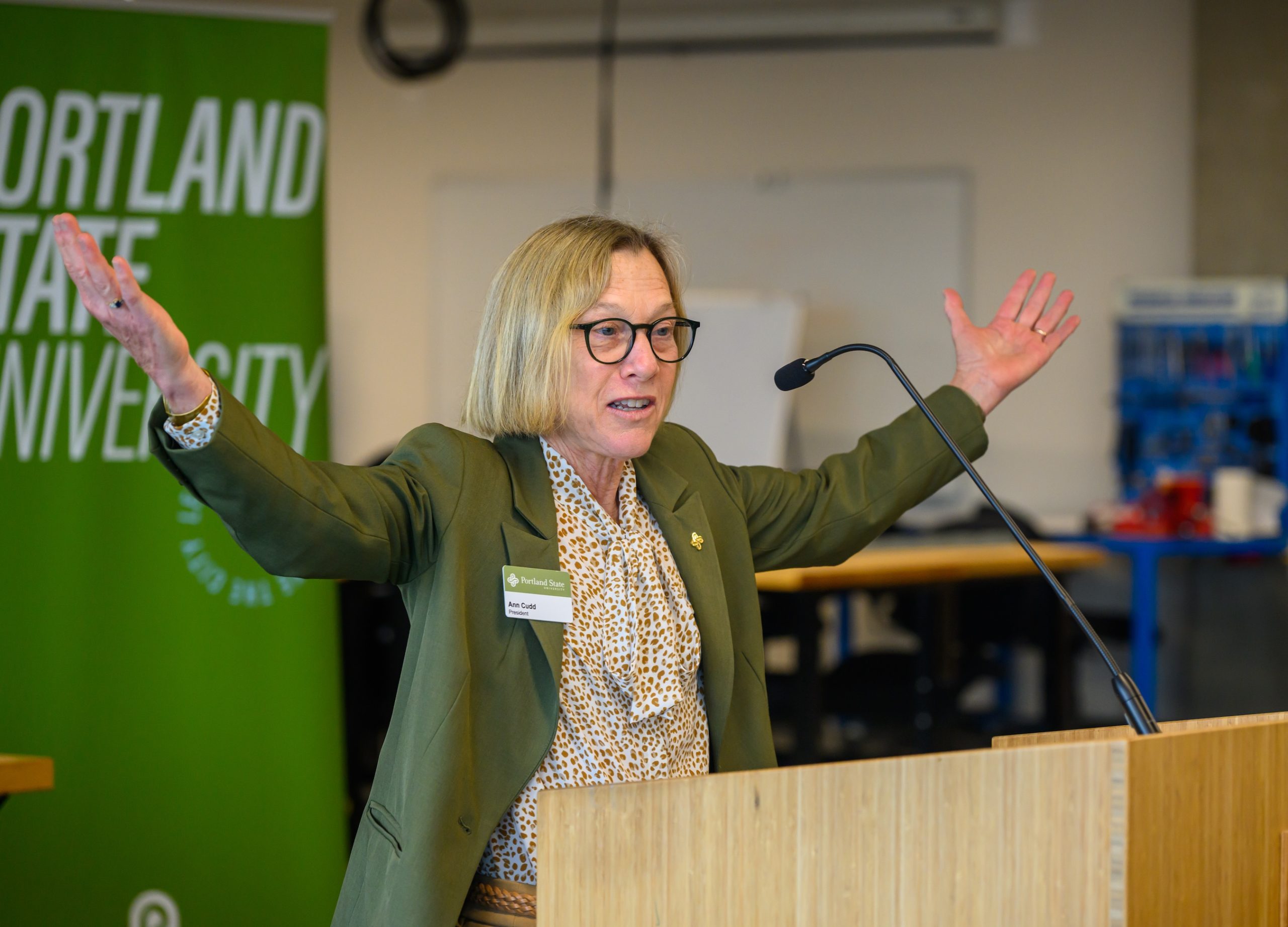 From left, Congresswoman Suzanne Bonamici, PCC President Adrien Bennings, PSU President Ann Cudd, State Sen. Janeen Sollman, Oregon Business Council's Duncan Wyse and Intel's Courtney Martin