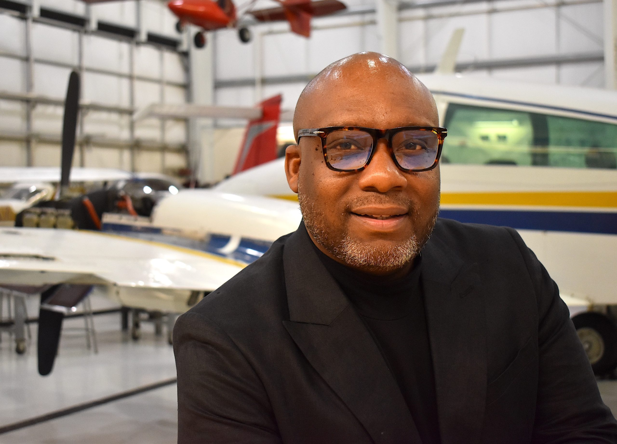 Josh Coleman at the aviation hangar at Rock Creek Campus.