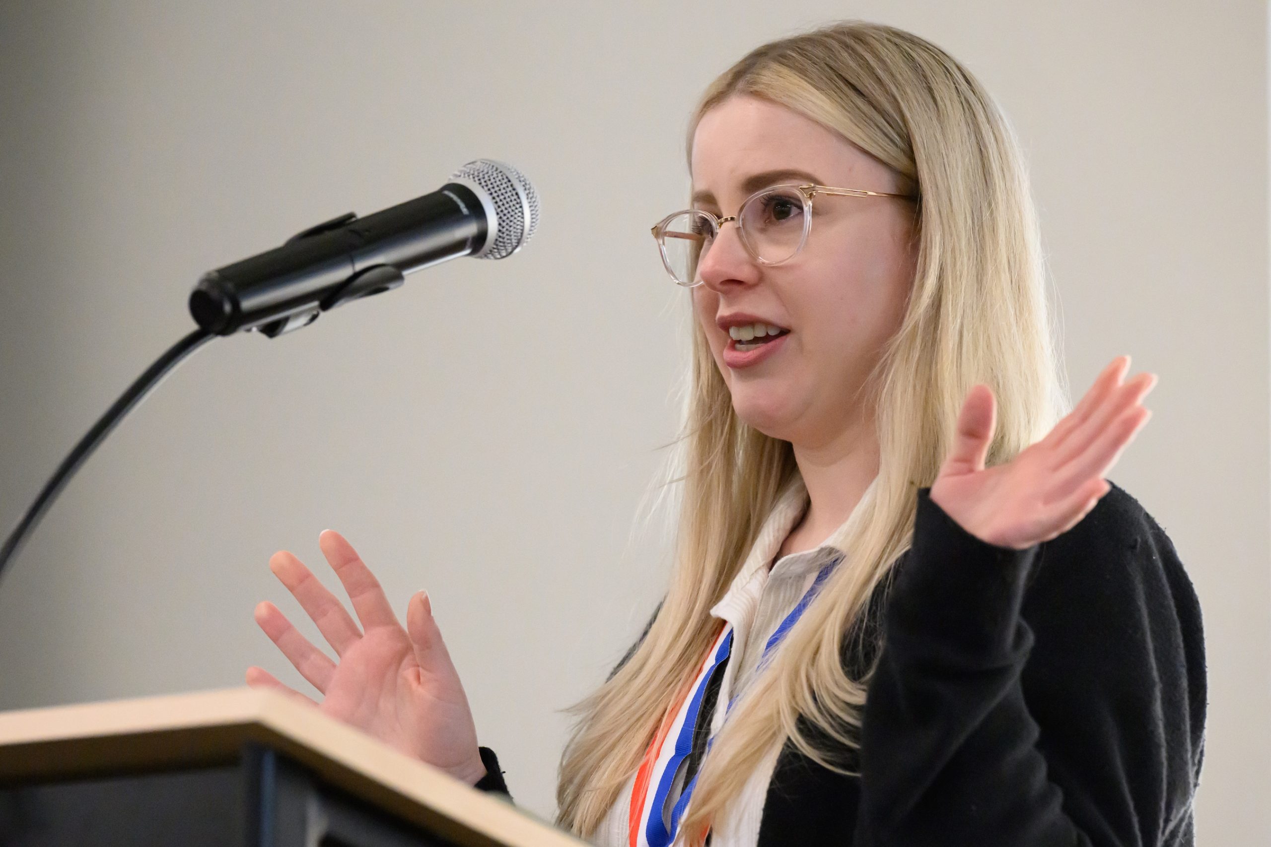 An emotional Gina Ferguson speaking at the All-Oregon Academic Team Award Luncheon in April.