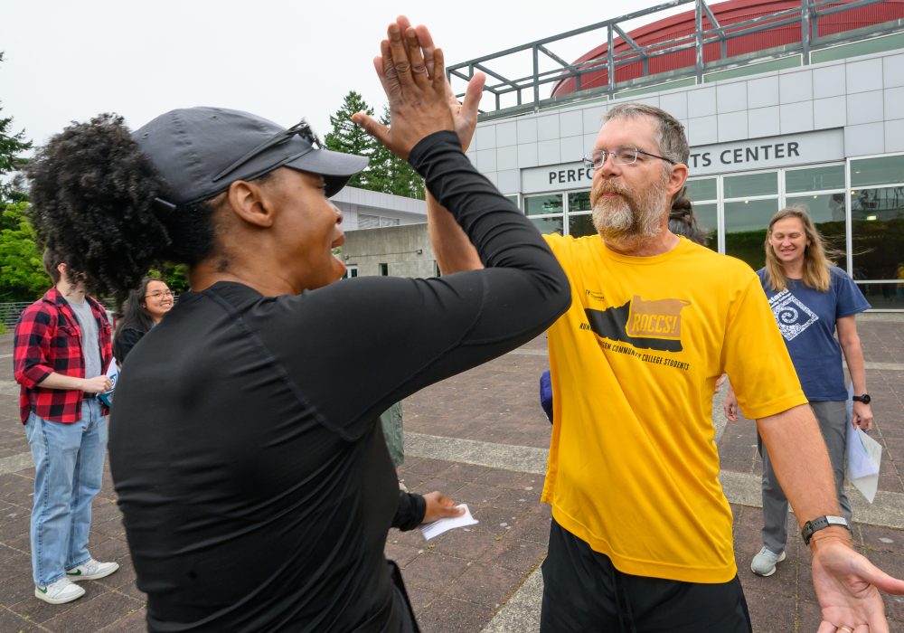Clackamas President Tim Cook (right) sprints up hill near Sylvania’s Performing Arts Center with PCC President Adrien Bennings (sunglasses).