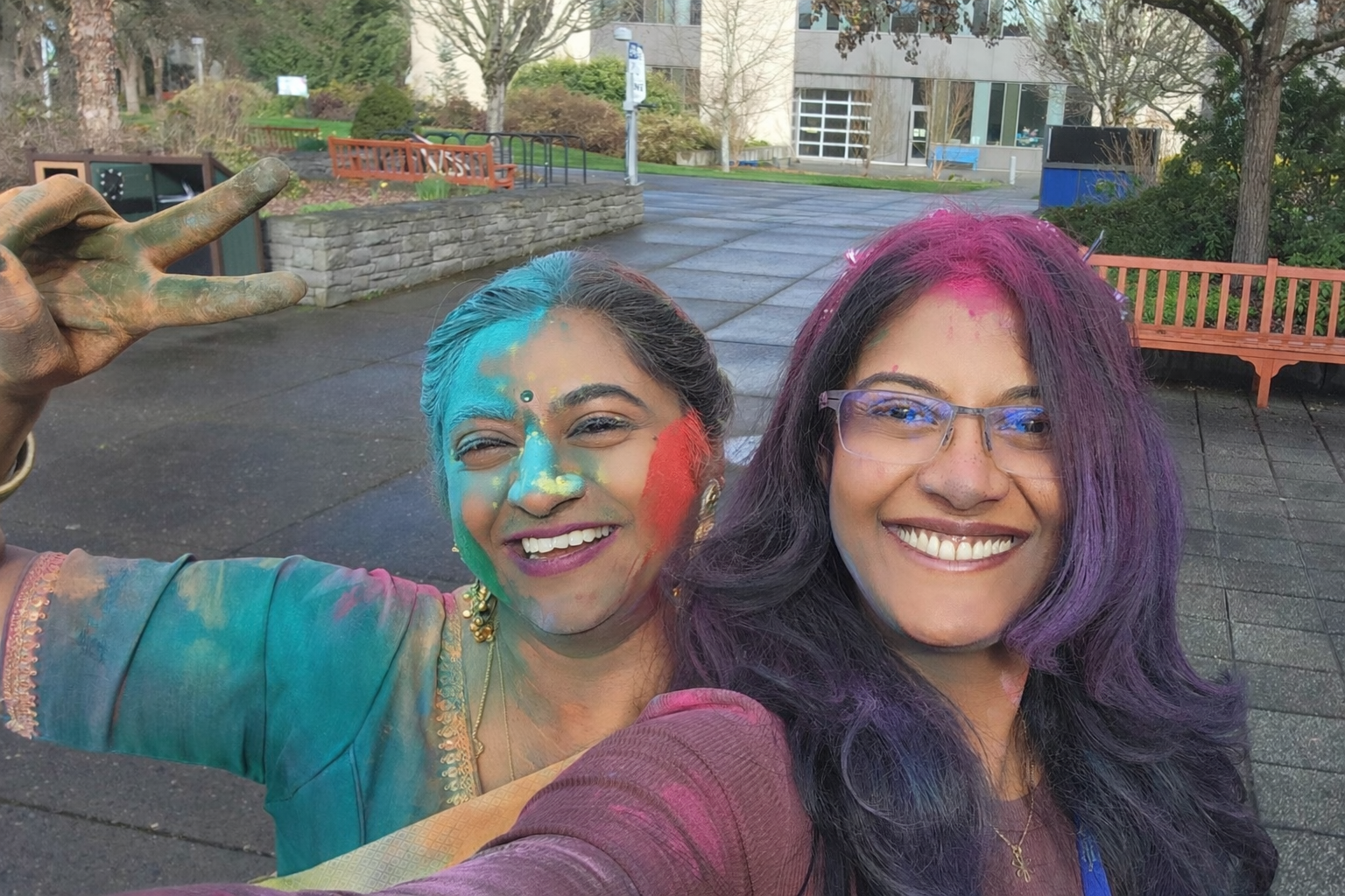 Two women taking a selfie covered in holi colors.