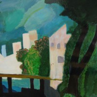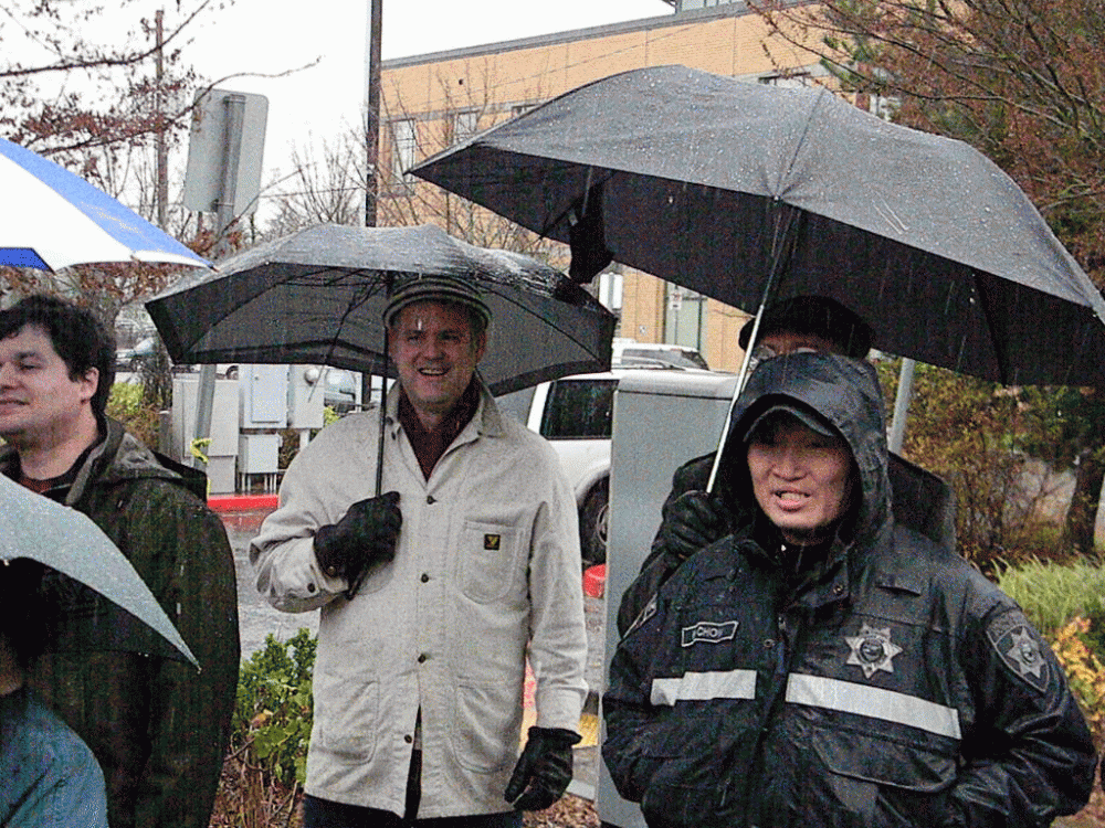 Campus and community members hover on the edges of the event tent with the protection of umbrellas.