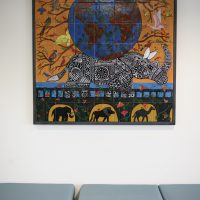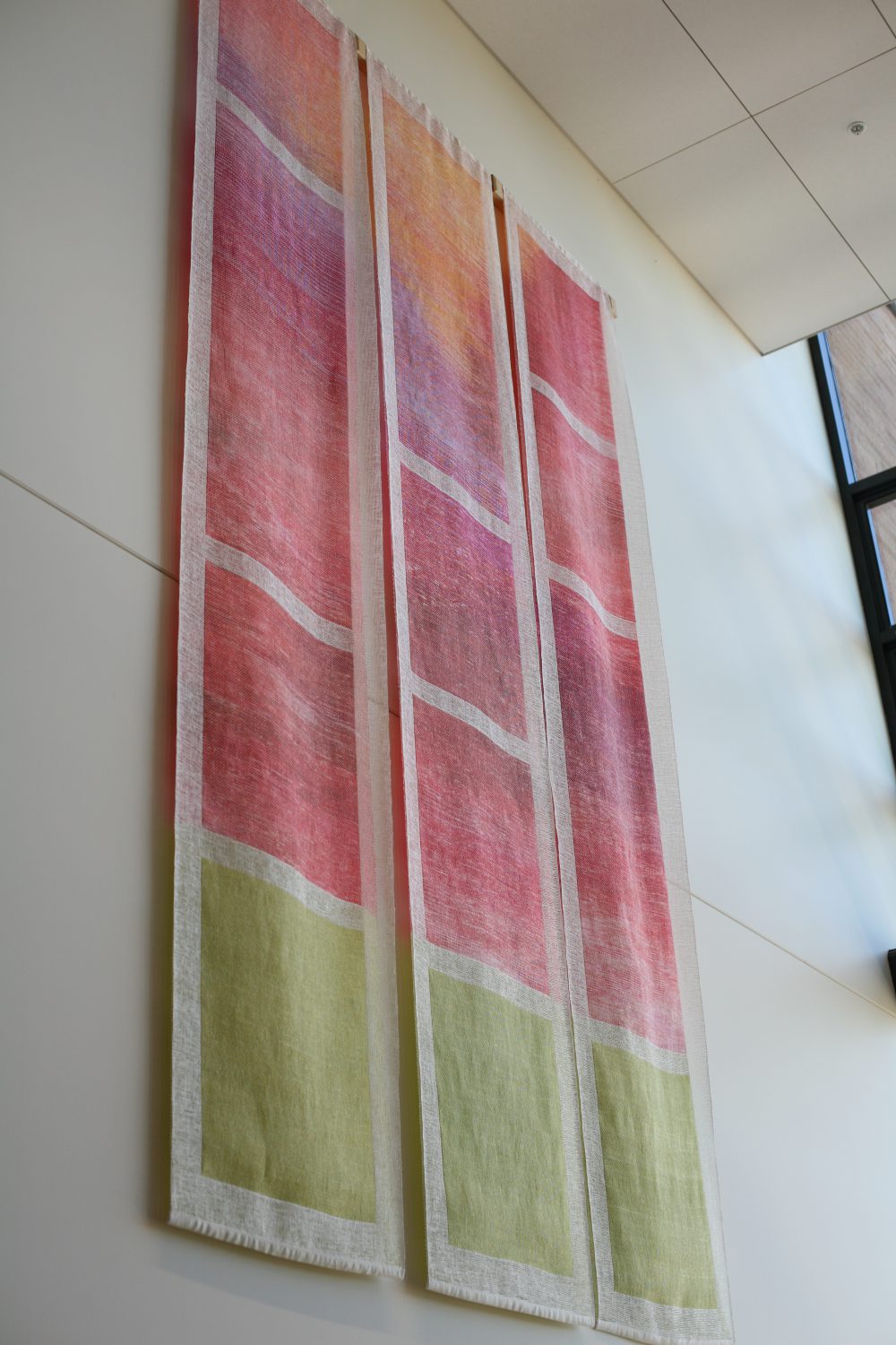 “Emergence,” by Kristin Pesola, is a double weave made from pine paper, linen paper and silk. It hangs in a two-story study space in Cascade Hall, and when the adjacent windows are open the textile flutters lightly in the breeze.