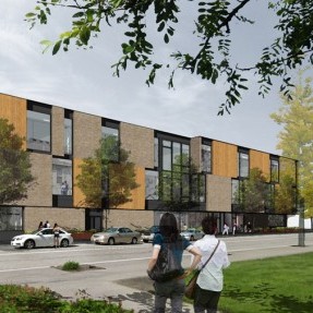 The architectural rendering of the new Academic Building at Cascade Campus shows the frontage along N. Jessup Street.