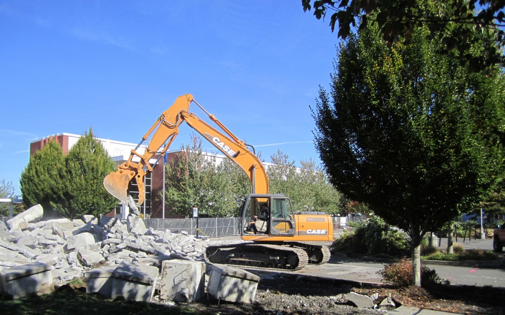 Traci Jantz with M&M Construction Services, Inc. operates a track hoe to remove sidewalks. Concrete will be crushed and reused on site for fill material.