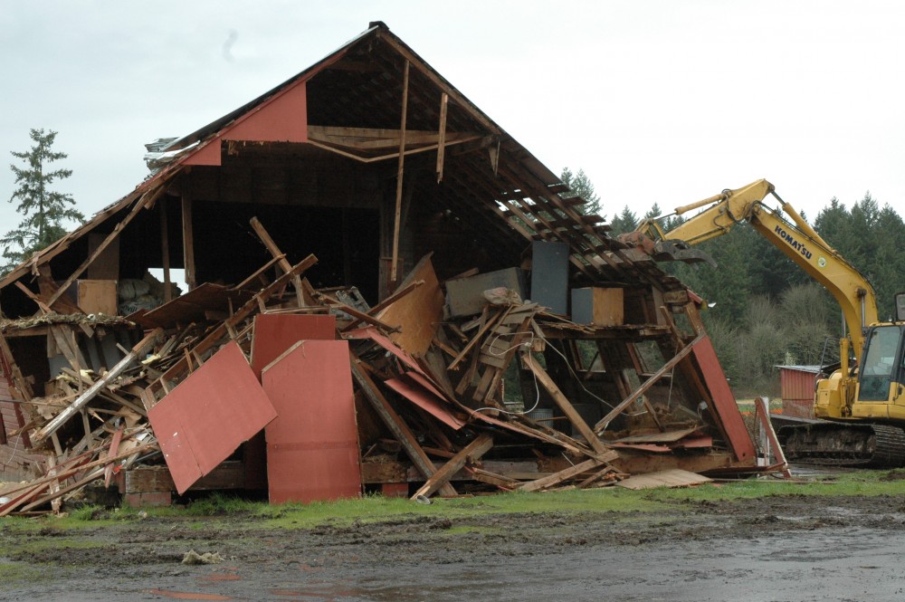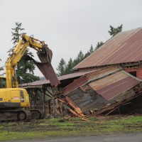 A backhoe operator with Northwest Infrastructure demolishes an old barn at the farm on the west side of Rock Creek Campus. A new shop building for PCC’s Veterinary Technology program -- part of the improvements funded by the 2008-voter approved bond measure -- will be constructed on the site. The vet tech program is the only one of its kind in Oregon, and only one of four in the Pacific Northwest. March 11, 2016. Photo by Terry Lookabill.