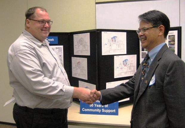 Wing-Kit Chung, PCC Vice President of Administrative Services, shakes hands with Greg Malinowski, Washington County Commissioner for District 2, during the meeting.