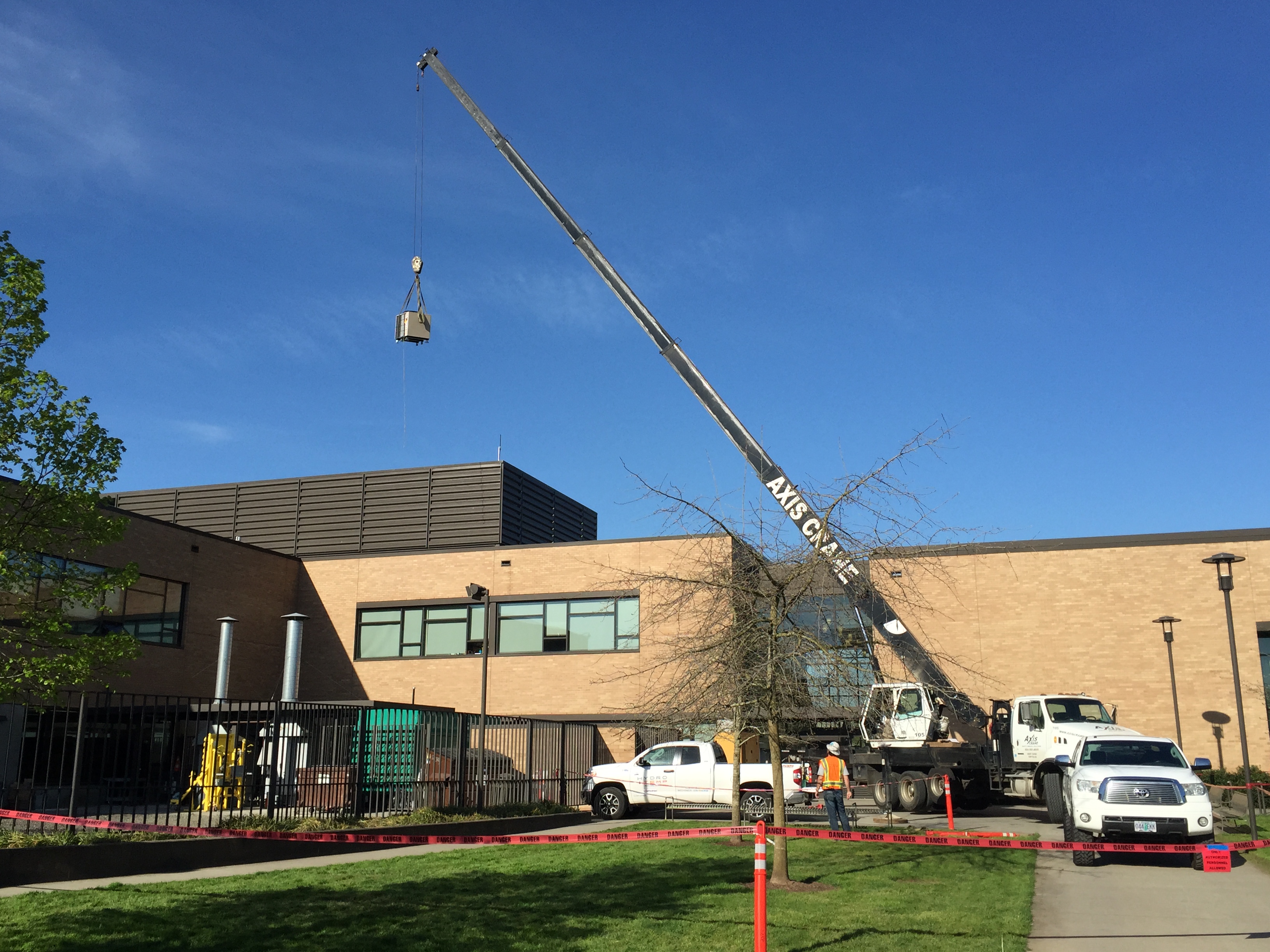 HydroTemp Mechanical workers use a hydraulic boom crane to gingerly hoist one of two new 570-pound condensing units on top of PCC Cascade’s Moriarty Building. The units cool the building’s MDF room, the backbone of Cascade Campus’ telecommunications network. The work is part of a technology upgrade funded by the 2008 voter-approved bond measure. April 8, 2016/Photo courtesy Hoffman Construction