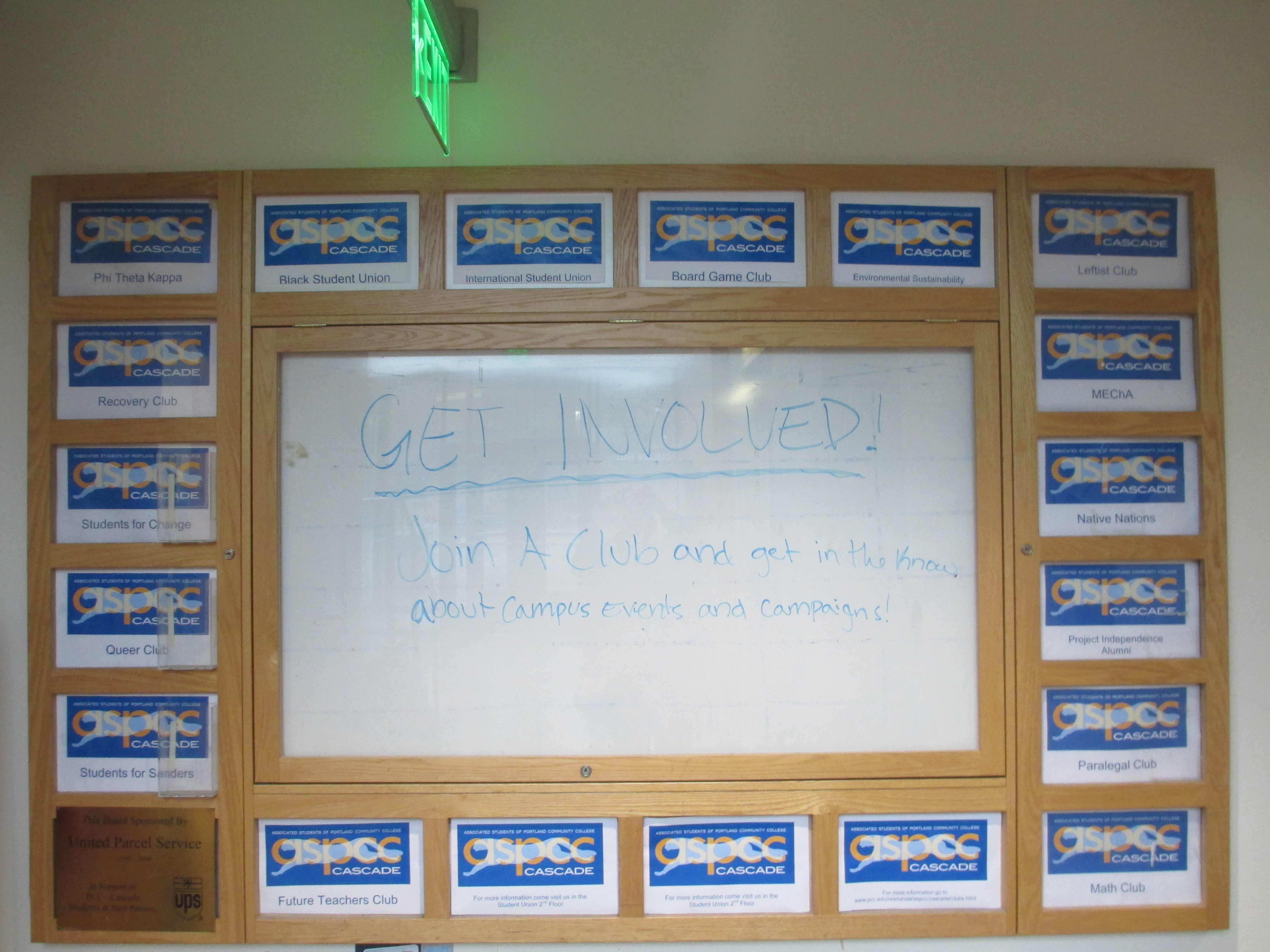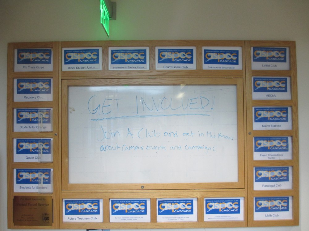 A display on the Union's first floor indicates the numerous clubs that are available to Cascade students, including one for future teachers, math fans, even for board games. Jan. 12, 2016