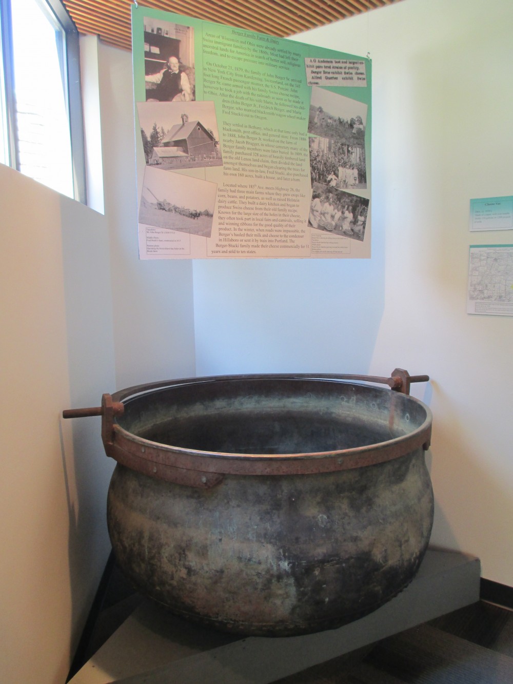 The Stucki Family cheese vat was made circa 1870s. It is made of copper, with iron handles and could hold 150 gallons of milk.