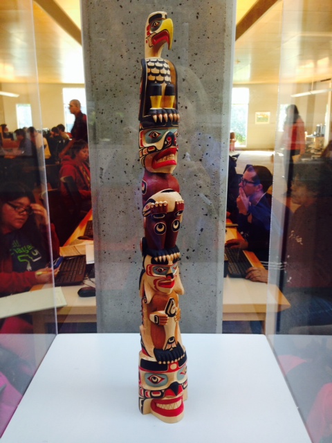 Miniature Welcome Pole totem in PCC Sylvania library.