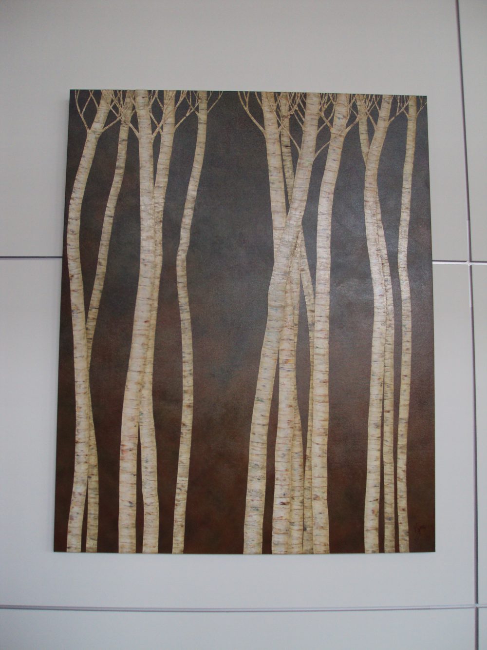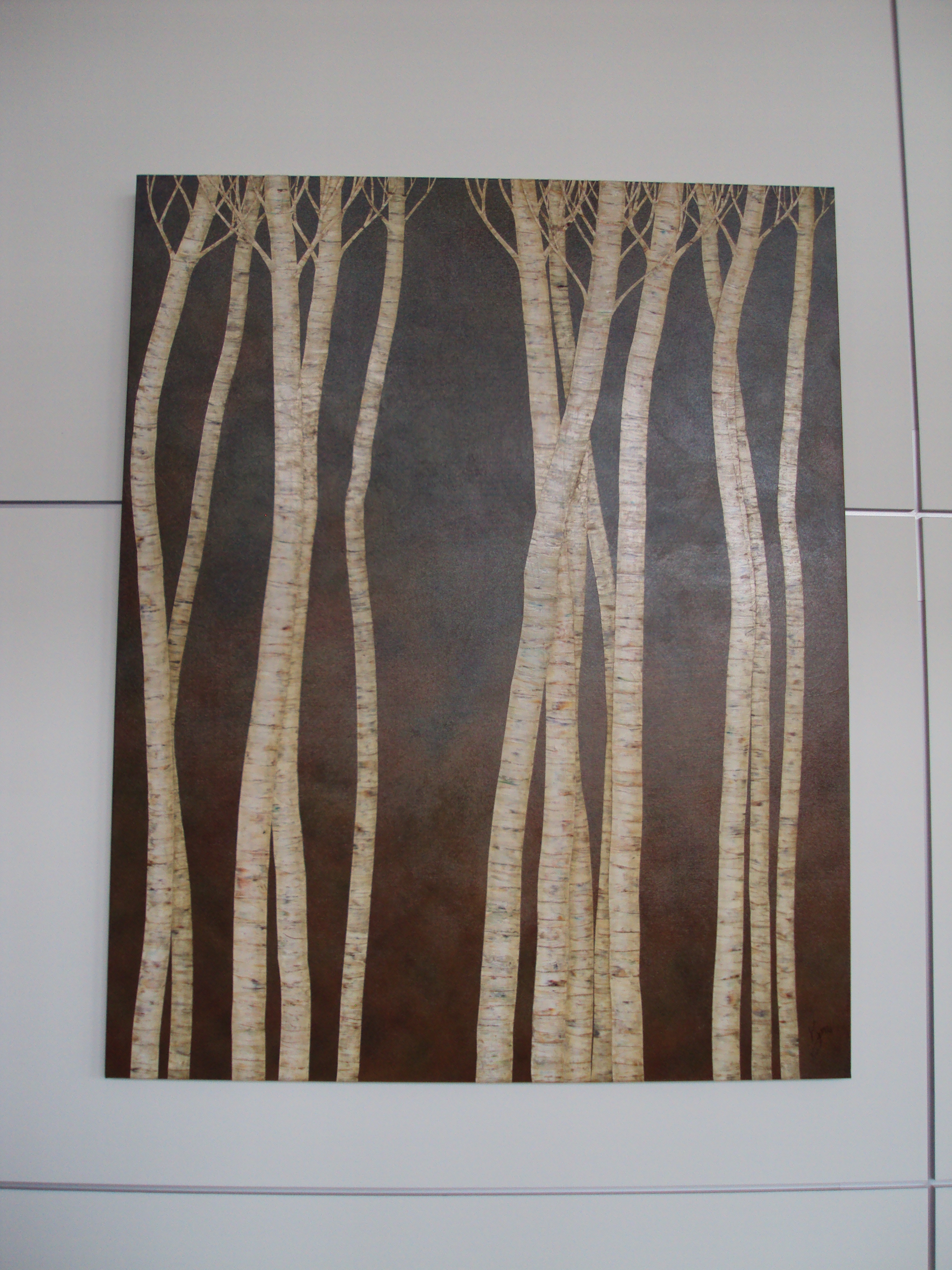 Birch trees inspired this oil painting by Newberg artist Kathleen Jones. The piece hangs at Newberg Center, which specified that artists consider sustainability in their submissions.