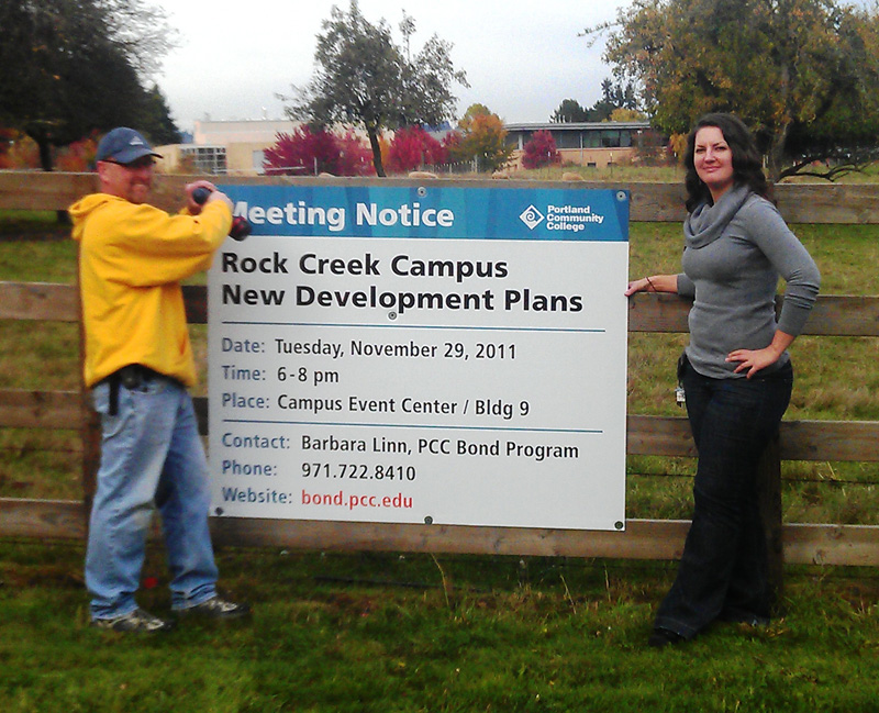In preparation for the Neighborhood Review Meeting on November 29, 2011, PCC Facilities staff posted event signage near the entrance of Rock Creek Campus.