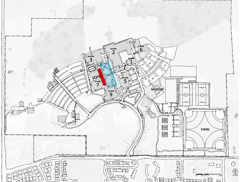Site plan for proposed 30,000 square foot addition for Building 7 (red area) and upgrades to the adjacent quad (blue area) at Rock Creek Campus. Event will take place in Building 9.