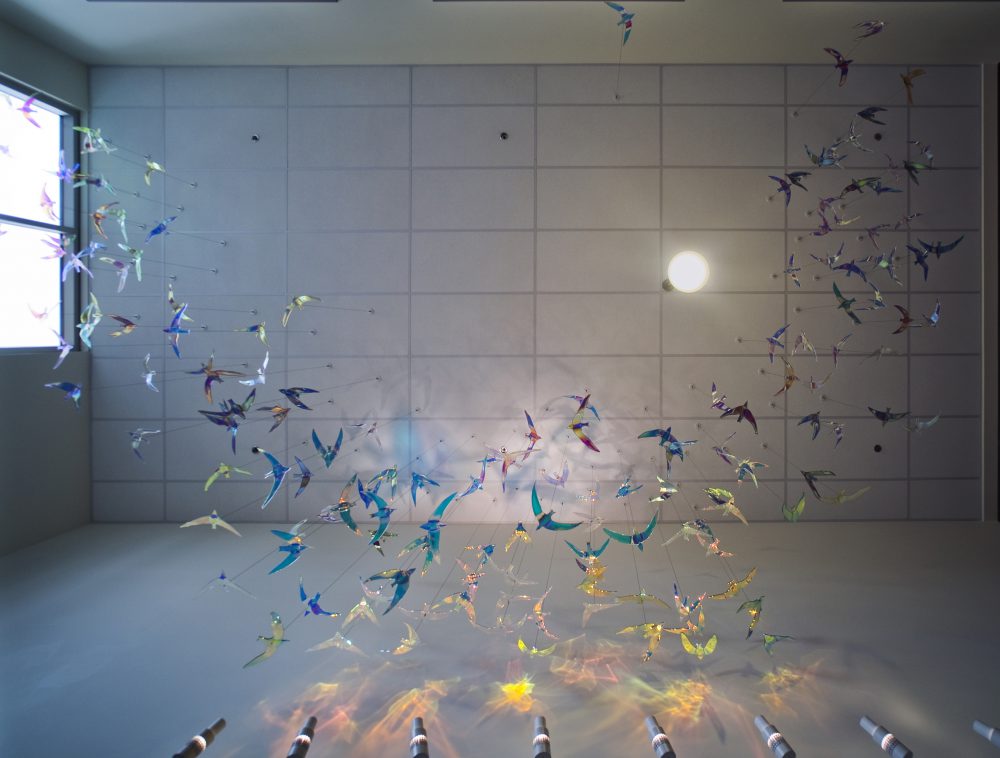 An installation featuring more than 150 colored glass birds suspended from the ceiling.