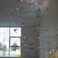 “A Sweep of Swifts” features more than 150 colored glass birds suspended from the ceiling in an entry to Southeast Campus' Student Commons. The installation celebrates the Vaux’s swifts that roost in a chimney at Portland's Chapman Elementary School. Art by Michele Gutlove, Design Studio GH, LLC; photo by Zev Hoover, Design Studio GH, LLC.
