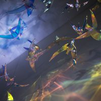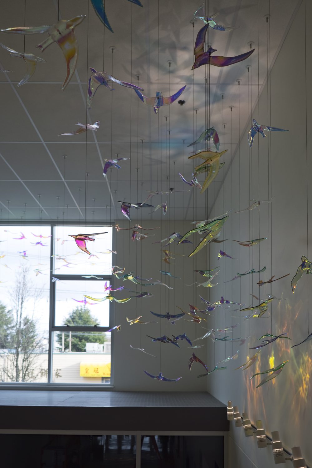 An installation featuring more than 150 colored glass birds suspended from the ceiling.