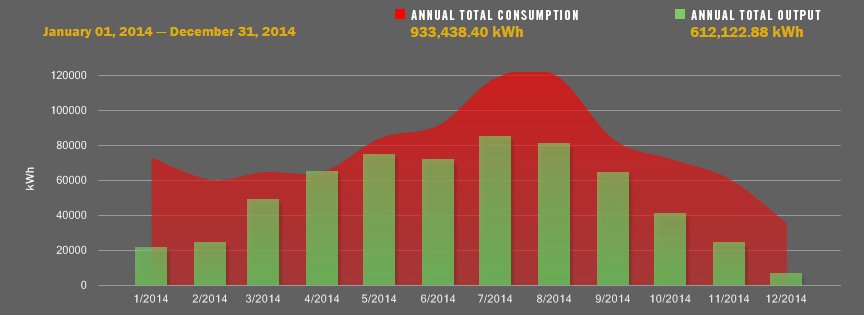 SolarCity's online monitor allows readers to see how much power the solar array is generating for Rock Creek's Building 9 by the hour, day, week, month or year. The green bars represent the amount of power generated, the red ??? shows how much power is being used.