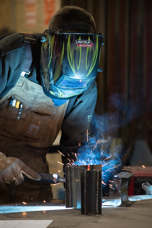 Zach Tuttle works on his MIG welding technique in Rock Creek's newly remodeled Welding Technology shop.