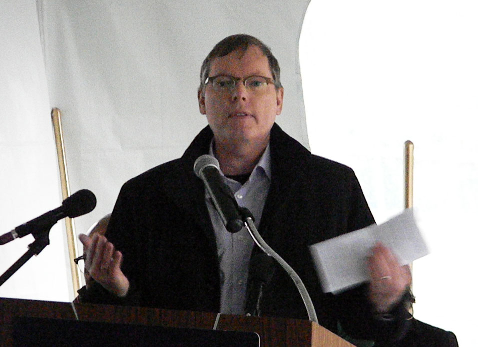 Will Dann, the lead architect from THA, guides the audience through a "virtual tour" of the new campus buildings.