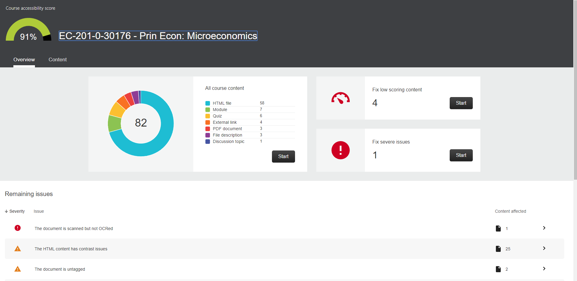 We hit some snags with getting the tool approved during fall term, but we’re just about ready to enable Ally in our production D2L environment for any willing participants. Then, by Summer, we hope to have the tool active for all classes in D2L. Then, we will be able to start scanning every course in the LMS to report on overall accessibility of course content. While the reporting is neat, the real power is that it allows instructors to review and make quick updates to their own content to improve the accessibility of their instructional content. It works with Office Documents, PDFs, HTML and more. We’re super excited about the tool and you’ll here more soon. In the meantime, here’s an overview report for a sample class. Hit us up if you want to try it out this winter.