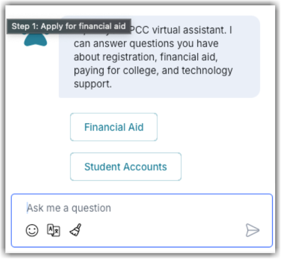 Check out the new chatbot from Virtual Services, supporting students reaching out on Enrollment Services, Student Accounts, and the Learning Technology Help Desk. This AI-assisted bot will attempt to answer common questions from our website and curated responses. If it cannot answer you, it will connect you with a person.
