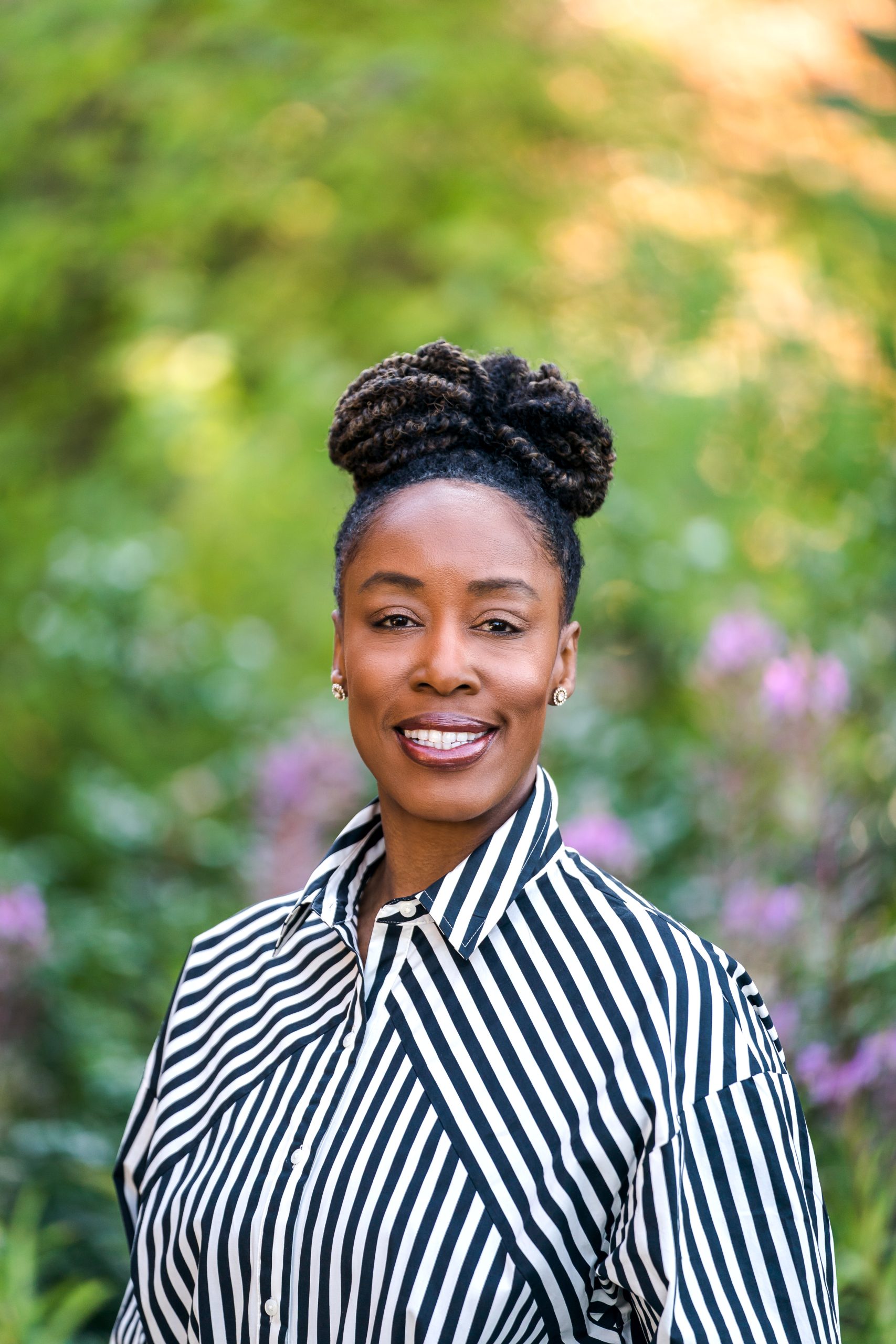 • Dr. Adrien Bennings standing outside wearing a black and white striped shirt